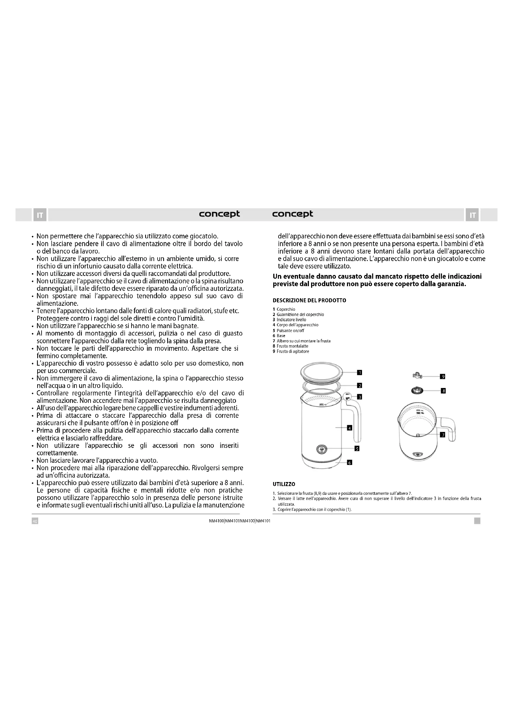 Scarica le istruzioni per il tuo Montalatte in formato PDF gratuitamente! Trova il tuo manuale NM4101 - Concept e riprendi in mano il tuo dispositivo elettronico. In questa pagina sono pubblicati tutti i documenti necessari per l'utilizzo del tuo dispositivo. NM4101 del marchio Concept.