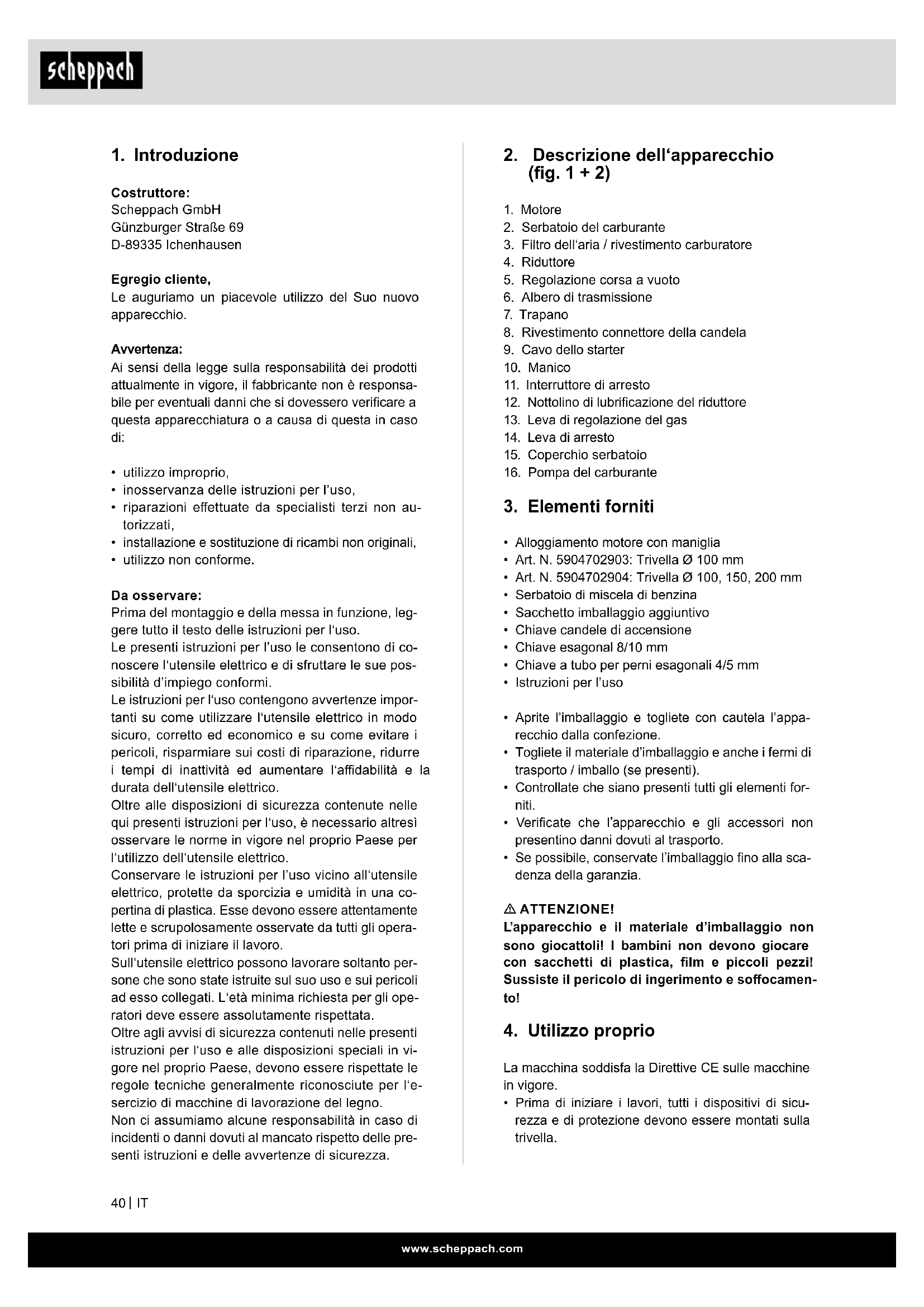 Costruttore: Scheppach GmbH Günzburger Straße 69 D-89335 Ichenhausen Egregio cliente, Le auguriamo un piacevole utilizzo del Suo nuovo apparecchio. Avvertenza: Ai sensi della legge sulla responsabilità dei prodotti attualmente in vigore, il fabbricante non è responsa- bile per eventuali danni che si dovessero vericare a questa apparecchiatura o a causa di questa in caso di:
