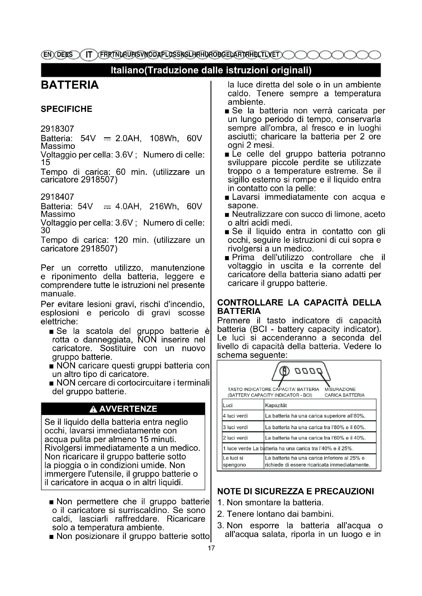 Tempo di carica: 120 min. (utilizzare un caricatore 2918507) Per un corretto utilizzo, manutenzione e riponimento della batteria, leggere e comprendere tutte le istruzioni nel presente manuale. Per evitare lesioni gravi, rischi d'incendio, esplosioni e pericolo di gravi scosse elettriche: ■ Se la scatola del gruppo batterie è rotta o danneggiata, NON inserire nel caricatore. Sostituire con un nuovo gruppo batterie. ■ NON caricare questi gruppi batteria con un altro tipo di caricatore. ■ NON cercare di cortocircuitare i terminali del gruppo batterie. AVVERTENZE Se il liquido della batteria entra neglio occhi, lavarsi immediatamente con acqua pulita per almeno 15 minuti. Rivolgersi immediatamente a un medico. Non ricaricare il gruppo batterie sotto la pioggia o in condizioni umide. Non immergere l'utensile, il gruppo batterie o il caricatore in acqua o in altri liquidi. ■ Non permettere che il gruppo batterie o il caricatore si surriscaldino. Se sono caldi, lasciarli raffreddare. Ricaricare solo a temperatura ambiente. ■ Non posizionare il gruppo batterie sotto la luce diretta del sole o in un ambiente caldo. Tenere sempre a temperatura ambiente. ■ Se la batteria non verrà caricata per un lungo periodo di tempo, conservarla sempre all'ombra, al fresco e in luoghi asciutti; charicare la batteria per 2 ore ogni 2 mesi. ■ Le celle del gruppo batteria potranno sviluppare piccole perdite se utilizzate troppo o a temperature estreme. Se il sigillo esterno si rompe e il liquido entra in contatto con la pelle: ■ Lavarsi immediatamente con acqua e sapone. ■ Neutralizzare con succo di limone, aceto o altri acidi medi. ■ Se il liquido entra in contatto con gli occhi, seguire le istruzioni di cui sopra e rivolgersi a un medico. ■ Prima dell'utilizzo controllare che il voltaggio in uscita e la corrente del caricatore della batteria siano adatti per caricare il gruppo batterie.