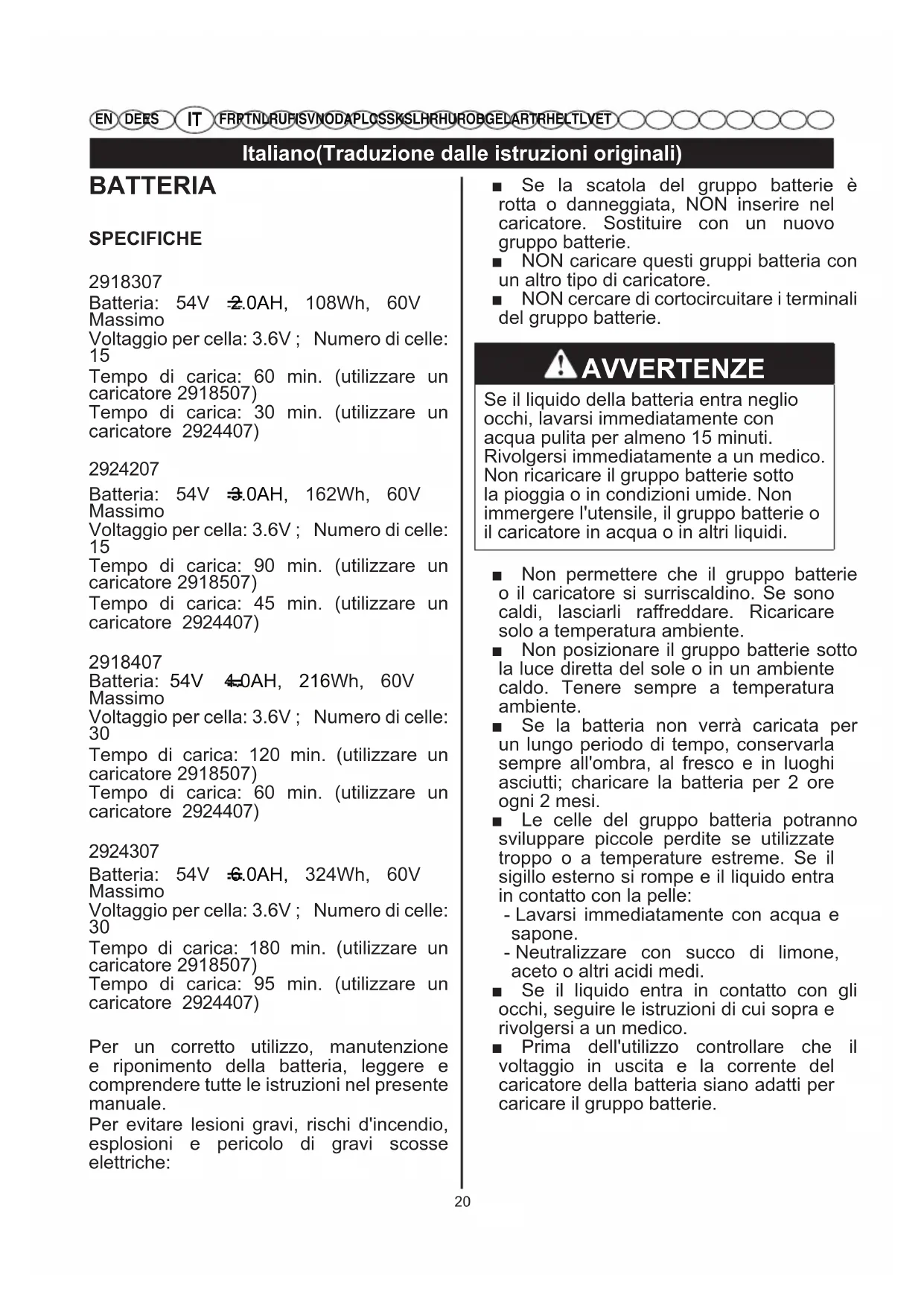 Tempo di carica: 180 min. (utilizzare un caricatore 2918507) Tempo di carica: 95 min. (utilizzare un caricatore 2924407) Per un corretto utilizzo, manutenzione e riponimento della batteria, leggere e comprendere tutte le istruzioni nel presente manuale. Per evitare lesioni gravi, rischi d'incendio, esplosioni e pericolo di gravi scosse elettriche: ■ Se la scatola del gruppo batterie è rotta o danneggiata, NON inserire nel caricatore. Sostituire con un nuovo gruppo batterie. ■ NON caricare questi gruppi batteria con un altro tipo di caricatore. ■ NON cercare di cortocircuitare i terminali del gruppo batterie. AVVERTENZE Se il liquido della batteria entra neglio occhi, lavarsi immediatamente con acqua pulita per almeno 15 minuti. Rivolgersi immediatamente a un medico. Non ricaricare il gruppo batterie sotto la pioggia o in condizioni umide. Non immergere l'utensile, il gruppo batterie o il caricatore in acqua o in altri liquidi. ■ Non permettere che il gruppo batterie o il caricatore si surriscaldino. Se sono caldi, lasciarli raffreddare. Ricaricare solo a temperatura ambiente. ■ Non posizionare il gruppo batterie sotto la luce diretta del sole o in un ambiente caldo. Tenere sempre a temperatura ambiente. ■ Se la batteria non verrà caricata per un lungo periodo di tempo, conservarla sempre all'ombra, al fresco e in luoghi asciutti; charicare la batteria per 2 ore ogni 2 mesi. ■ Le celle del gruppo batteria potranno sviluppare piccole perdite se utilizzate troppo o a temperature estreme. Se il sigillo esterno si rompe e il liquido entra in contatto con la pelle: - Lavarsi immediatamente con acqua e sapone. - Neutralizzare con succo di limone, aceto o altri acidi medi. ■ Se il liquido entra in contatto con gli occhi, seguire le istruzioni di cui sopra e rivolgersi a un medico. ■ Prima dell'utilizzo controllare che il voltaggio in uscita e la corrente del caricatore della batteria siano adatti per caricare il gruppo batterie.Italiano(Traduzione dalle istruzioni originali)