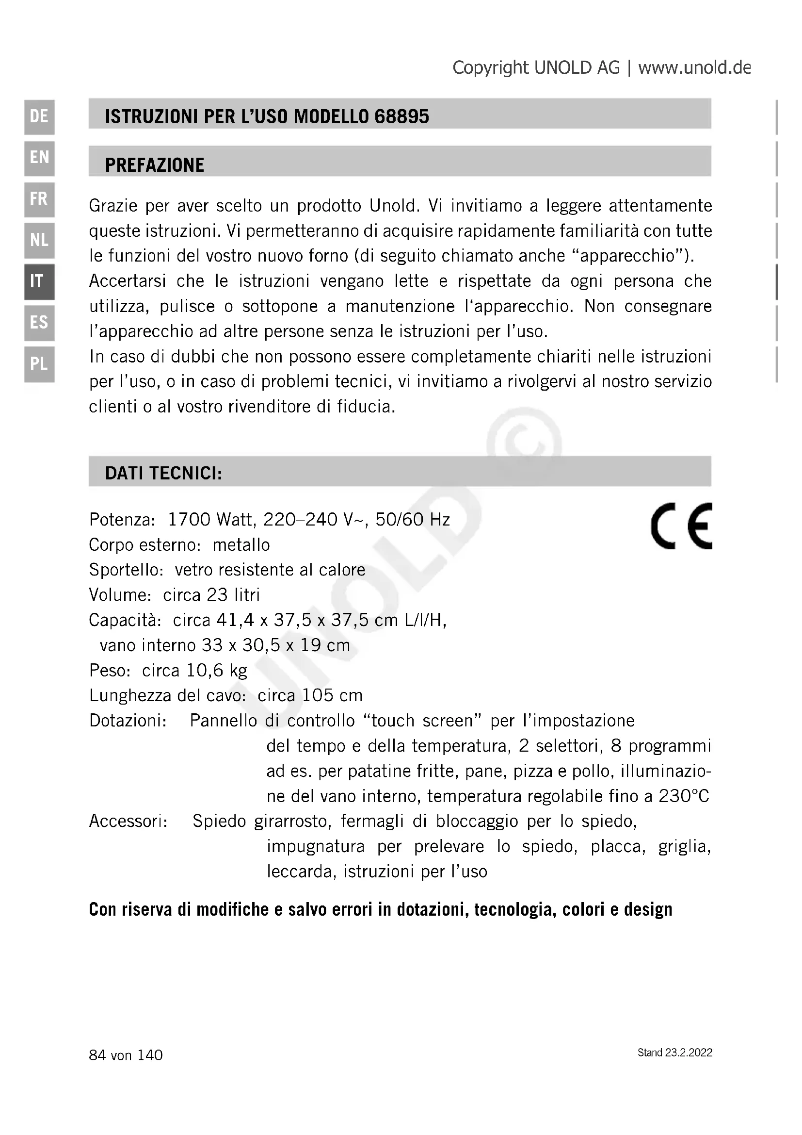 DATI TECNICI: Potenza: 1700 Watt, 220–240 V~, 50/60 Hz Corpo esterno: metallo Sportello: vetro resistente al calore Volume: circa 23 litri Capacità: circa 41,4 x 37,5 x 37,5 cm L/l/H, vano interno 33 x 30,5 x 19 cm Peso: circa 10,6 kg Lunghezza del cavo: circa 105 cm Dotazioni: Pannello di controllo “touch screen” per l’impostazione del tempo e della temperatura, 2 selettori, 8 programmi ad es. per patatine fritte, pane, pizza e pollo, illuminazio- ne del vano interno, temperatura regolabile fino a 230°C Accessori: Spiedo girarrosto, fermagli di bloccaggio per lo spiedo, impugnatura per prelevare lo spiedo, placca, griglia, leccarda, istruzioni per l’uso Con riserva di modifiche e salvo errori in dotazioni, tecnologia, colori e design PREFAZIONE Grazie per aver scelto un prodotto Unold. Vi invitiamo a leggere attentamente queste istruzioni. Vi permetteranno di acquisire rapidamente familiarità con tutte le funzioni del vostro nuovo forno (di seguito chiamato anche “apparecchio”). Accertarsi che le istruzioni vengano lette e rispettate da ogni persona che utilizza, pulisce o sottopone a manutenzione l‘apparecchio. Non consegnare l’apparecchio ad altre persone senza le istruzioni per l’uso. In caso di dubbi che non possono essere completamente chiariti nelle istruzioni per l’uso, o in caso di problemi tecnici, vi invitiamo a rivolgervi al nostro servizio clienti o al vostro rivenditore di fiducia. Copyright UNOLD AG | www.unold.de UNOLD ©Stand 23.2.2022 85 von 140