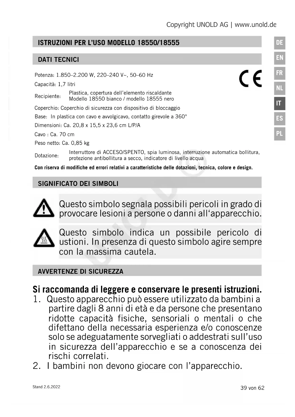 L’acqua bollente può provocare scottature. Utilizzare l’apparecchio con estrema attenzione se al suo interno c’è acqua bollente. Durante l’utilizzo l’apparecchio si riscalda molto! Copyright UNOLD AG | www.unold.de UNOLD ©Stand 2.6.2022 45 von 62