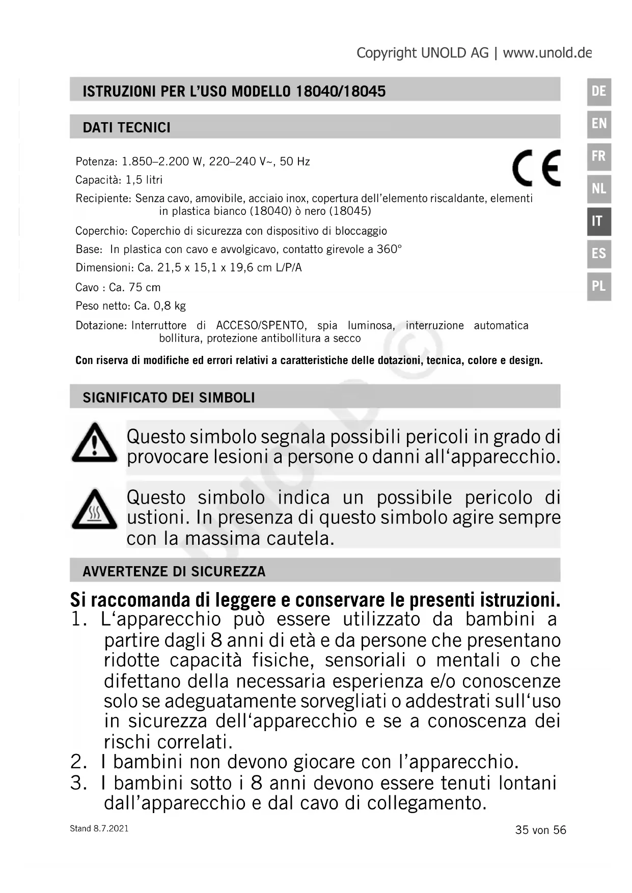 Questo simbolo segnala possibili pericoli in grado di provocare lesioni a persone o danni all‘apparecchio. Questo simbolo indica un possibile pericolo di ustioni. In presenza di questo simbolo agire sempre con la massima cautela. Potenza: 1.850–2.200 W, 220–240 V~, 50 Hz Capacità: 1,5 litri Recipiente: Senza cavo, amovibile, acciaio inox, copertura dell’elemento riscaldante, elementi in plastica bianco (18040) ò nero (18045) Coperchio: Coperchio di sicurezza con dispositivo di bloccaggio Base: In plastica con cavo e avvolgicavo, contatto girevole a 360° Dimensioni: Ca. 21,5 x 15,1 x 19,6 cm L/P/A Cavo : Ca. 75 cm Peso netto: Ca. 0,8 kg Dotazione: Interruttore di ACCESO/SPENTO, spia luminosa, interruzione automatica bollitura, protezione antibollitura a secco Con riserva di modifiche ed errori relativi a caratteristiche delle dotazioni, tecnica, colore e design.