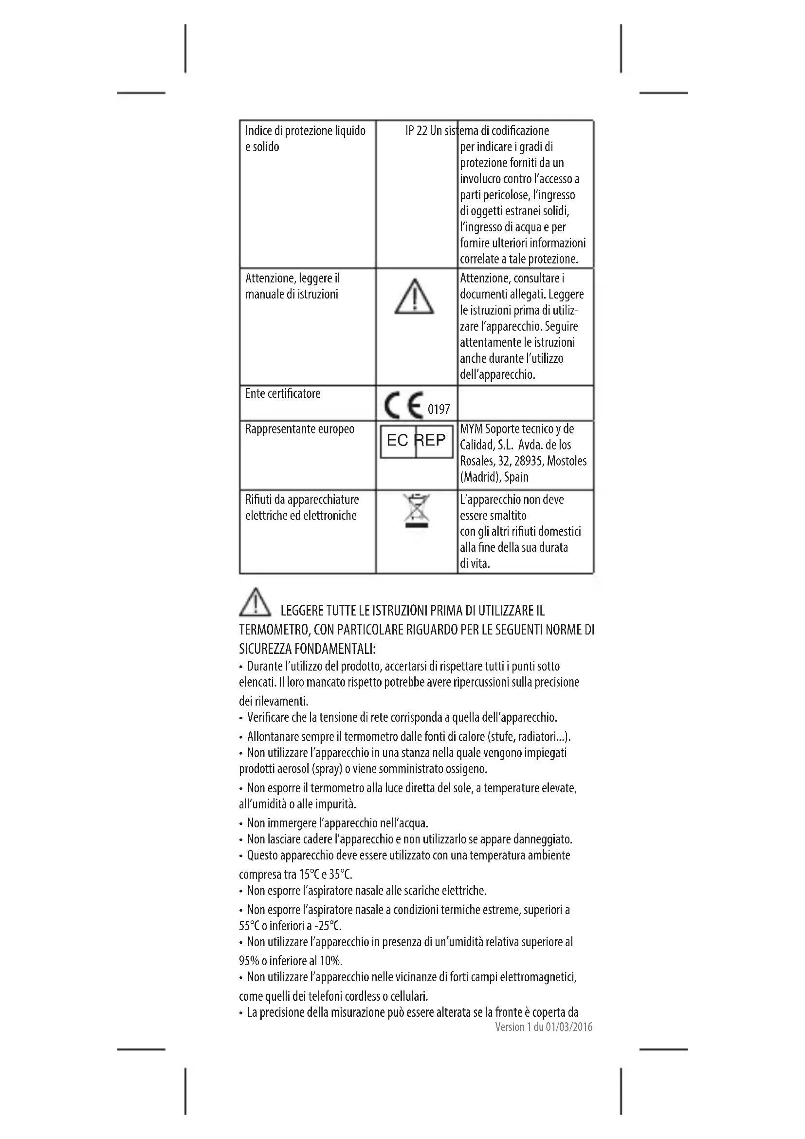 Rappresentante europeo EC REP MYM Soporte tecnico y de Calidad, S.L. Avda. de los Rosales, 32, 28935, Mostoles (Madrid), Spain Riuti da apparecchiature elettriche ed elettroniche L’apparecchio non deve essere smaltito con gli altri riuti domestici alla ne della sua durata di vita. LEGGERE TUTTE LE ISTRUZIONI PRIMA DI UTILIZZARE IL TERMOMETRO, CON PARTICOLARE RIGUARDO PER LE SEGUENTI NORME DI SICUREZZA FONDAMENTALI: