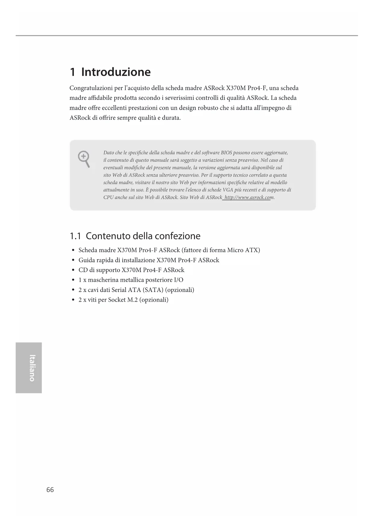 Italiano 1 Introduzione Congratulazioni per l’acquisto della scheda madre ASRock X370M Pro4-F, una scheda madre adabile prodotta secondo i severissimi controlli di qualità ASRock. La scheda madre ore eccellenti prestazioni con un design robusto che si adatta all'impegno di ASRock di orire sempre qualità e durata.