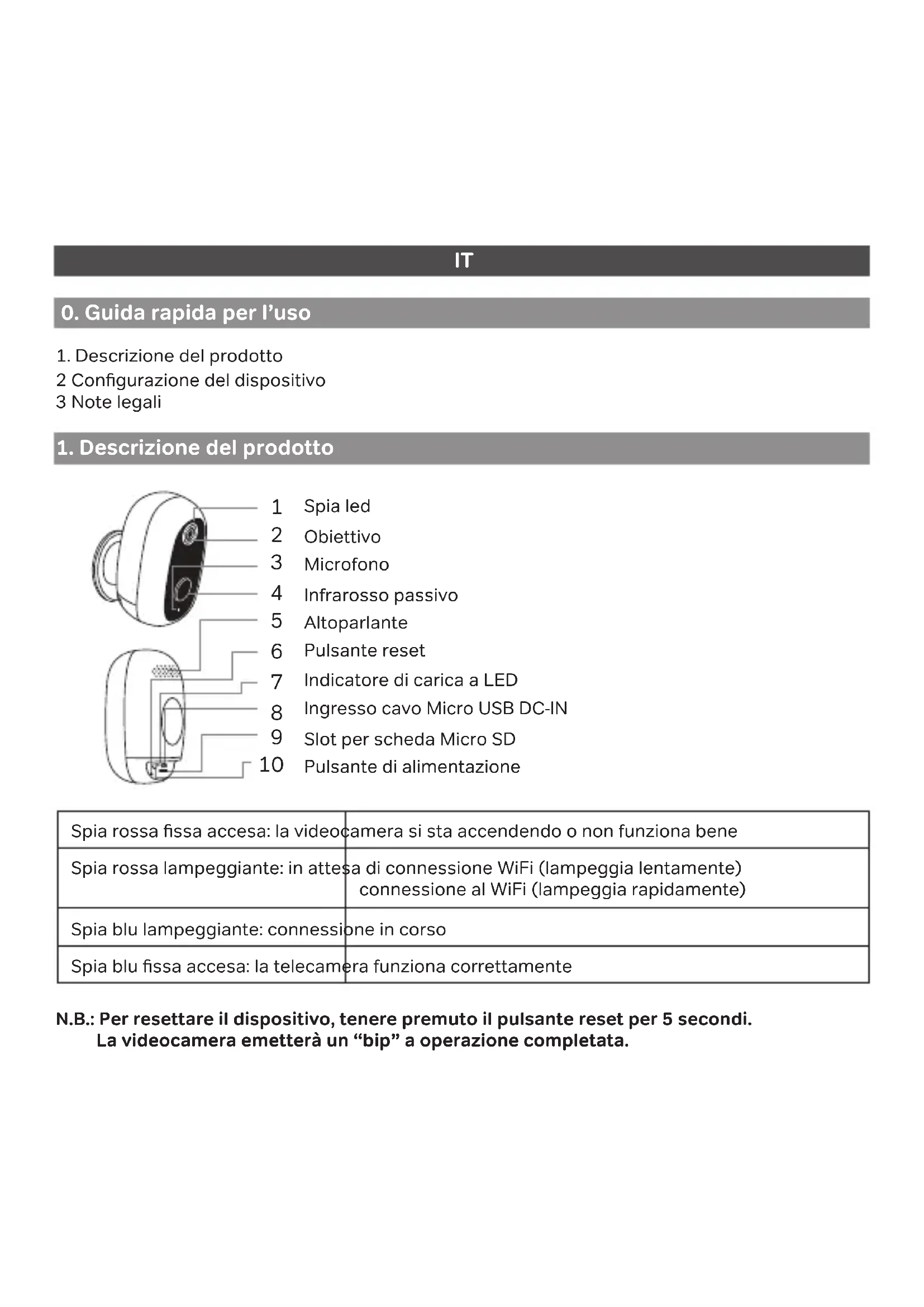 2 Congurazione del dispositivo 3 Note legali Spia led Obiettivo Microfono Infrarosso passivo Altoparlante Pulsante reset Indicatore di carica a LED Ingresso cavo Micro USB DC-IN Slot per scheda Micro SD Pulsante di alimentazione