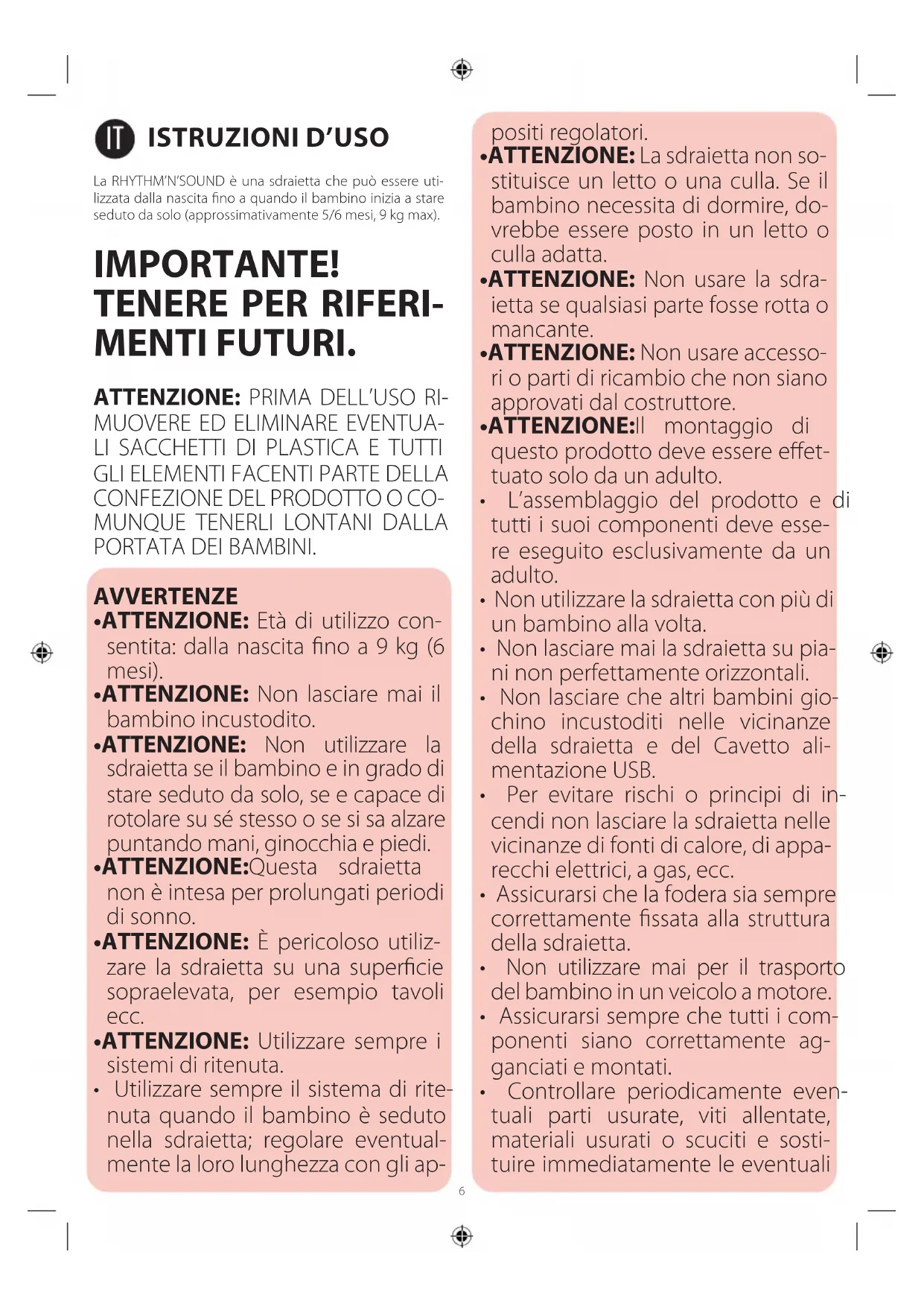 La RHYTHM’N’SOUND è una sdraietta che può essere uti- lizzata dalla nascita fino a quando il bambino inizia a stare seduto da solo (approssimativamente 5/6 mesi, 9 kg max). IMPORTANTE!