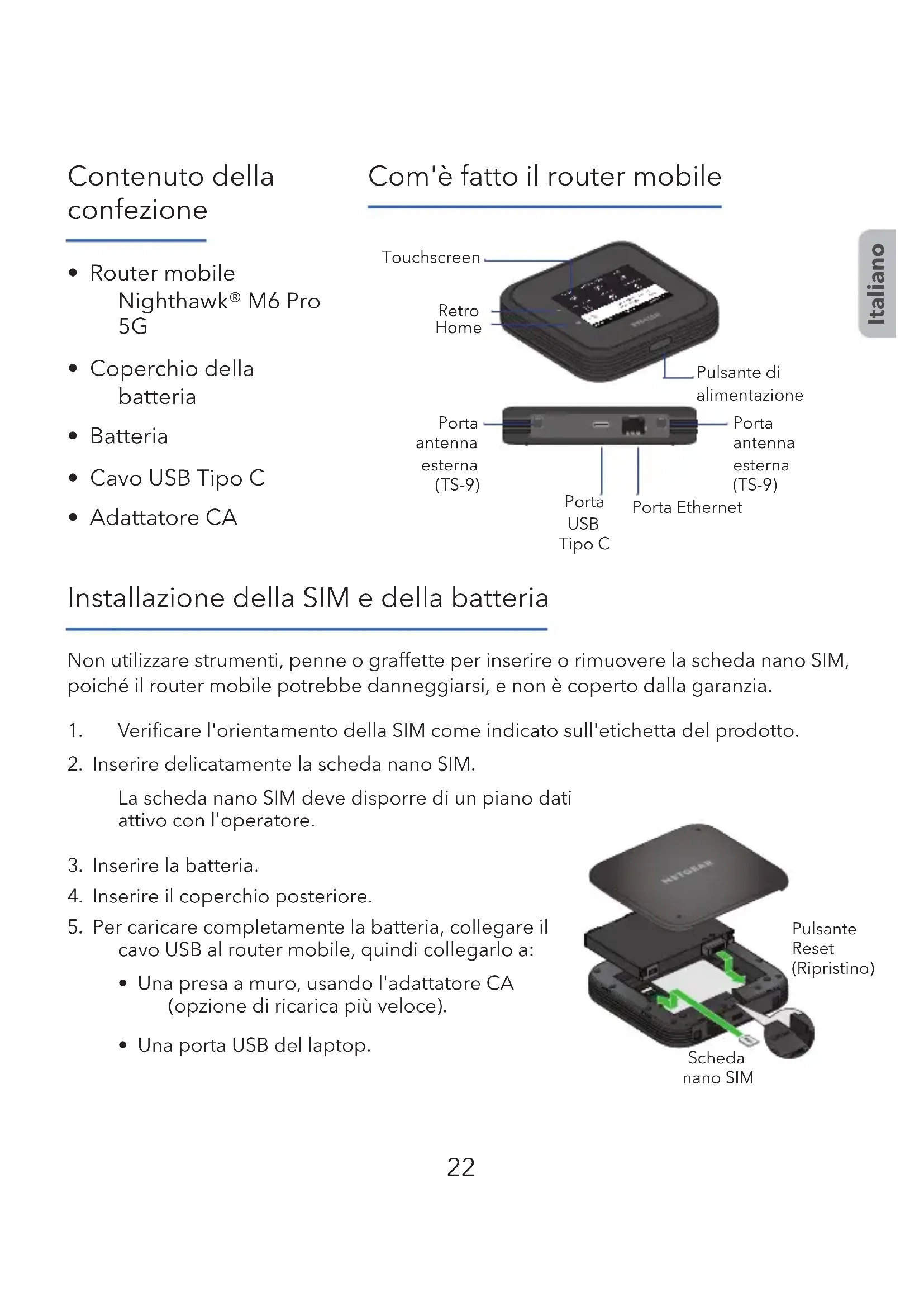 - Adattatore CA Com'è fatto il router mobile Italiano Porta Ethernet Porta antenna esterna (TS-9) Porta antenna esterna (TS-9) Porta USB Tipo C Pulsante di alimentazione Home Retro Touchscreen Installazione della SIM e della batteria Non utilizzare strumenti, penne o graffette per inserire o rimuovere la scheda nano SIM, poiché il router mobile potrebbe danneggiarsi, e non è coperto dalla garanzia.