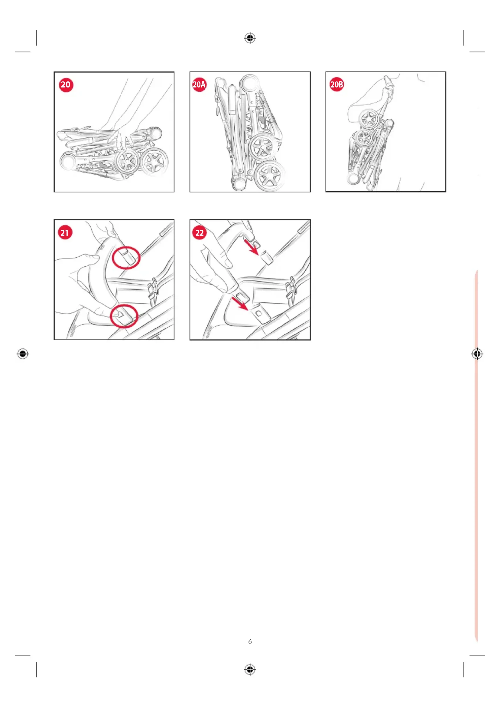 so il basso sino ad udire il clack di avvenuto bloccaggio (Fig. 20). Il passeggino, una volta chiuso, rimane in piedi da solo (Fig. 20A) e potrà essere facilmente trasportato grazie alla como- da cinghia di trasporto (Fig. 20B). MANICOTTO PARACOLPI Il passeggino è dotato di manicotto, ripiegabile durante le operazioni di chiusura.