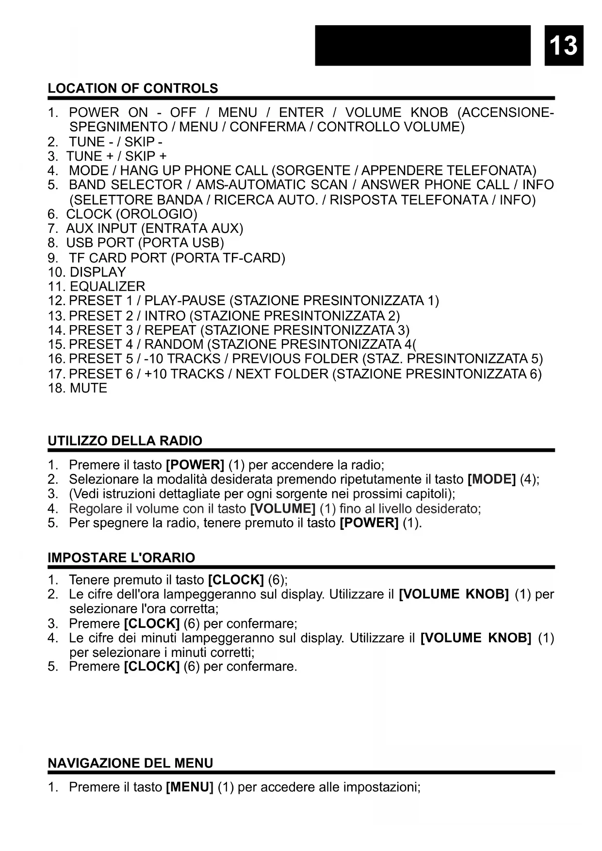 premuto (2 secondi) il tasto per scansionare la prossima/precedente stazione ra- dio disponibile. MEMORIZZAZIONE AUTOMATICA DELLE STAZIONI RADIO: Tenere premuto il tasto [AMS] (5) (per 3 secondi), la radio avvierà la scansione auto- matica. Durante il processo la radio salverà le stazioni nella memoria.