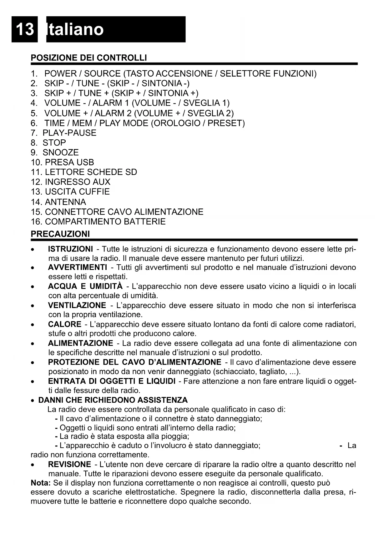 La radio deve essere controllata da personale qualificato in caso di: - Il cavo d’alimentazione o il connettre è stato danneggiato; - Oggetti o liquidi sono entrati all’interno della radio; - La radio è stata esposta alla pioggia; - L’apparecchio è caduto o l’involucro è stato danneggiato; - La radio non funziona correttamente. REVISIONE - L’utente non deve cercare di riparare la radio oltre a quanto descritto nel manuale. Tutte le riparazioni devono essere eseguite da personale qualificato. Nota: Se il display non funziona correttamente o non reagisce ai controlli, questo può essere dovuto a scariche elettrostatiche. Spegnere la radio, disconnetterla dalla presa, ri- muovere tutte le batterie e riconnettere dopo qualche secondo.14 Italiano