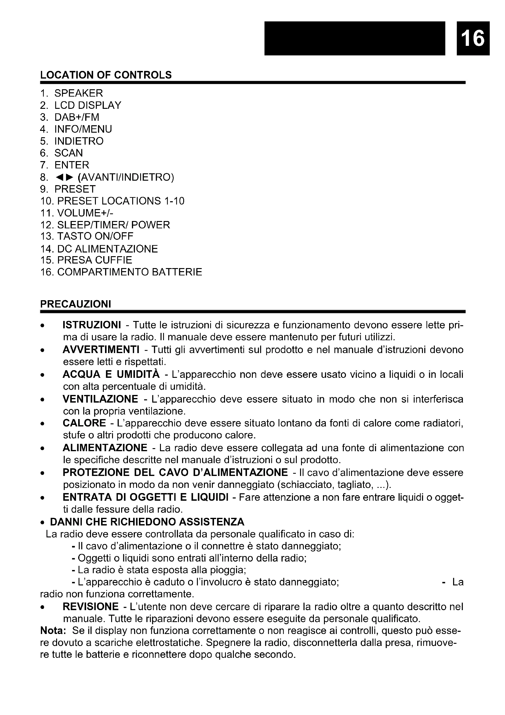 - REVISIONE - L’utente non deve cercare di riparare la radio oltre a quanto descritto nel manuale. Tutte le riparazioni devono essere eseguite da personale qualificato. Nota: Se il display non funziona correttamente o non reagisce ai controlli, questo può esse- re dovuto a scariche elettrostatiche. Spegnere la radio, disconnetterla dalla presa, rimuove- re tutte le batterie e riconnettere dopo qualche secondo.17 Italiano
