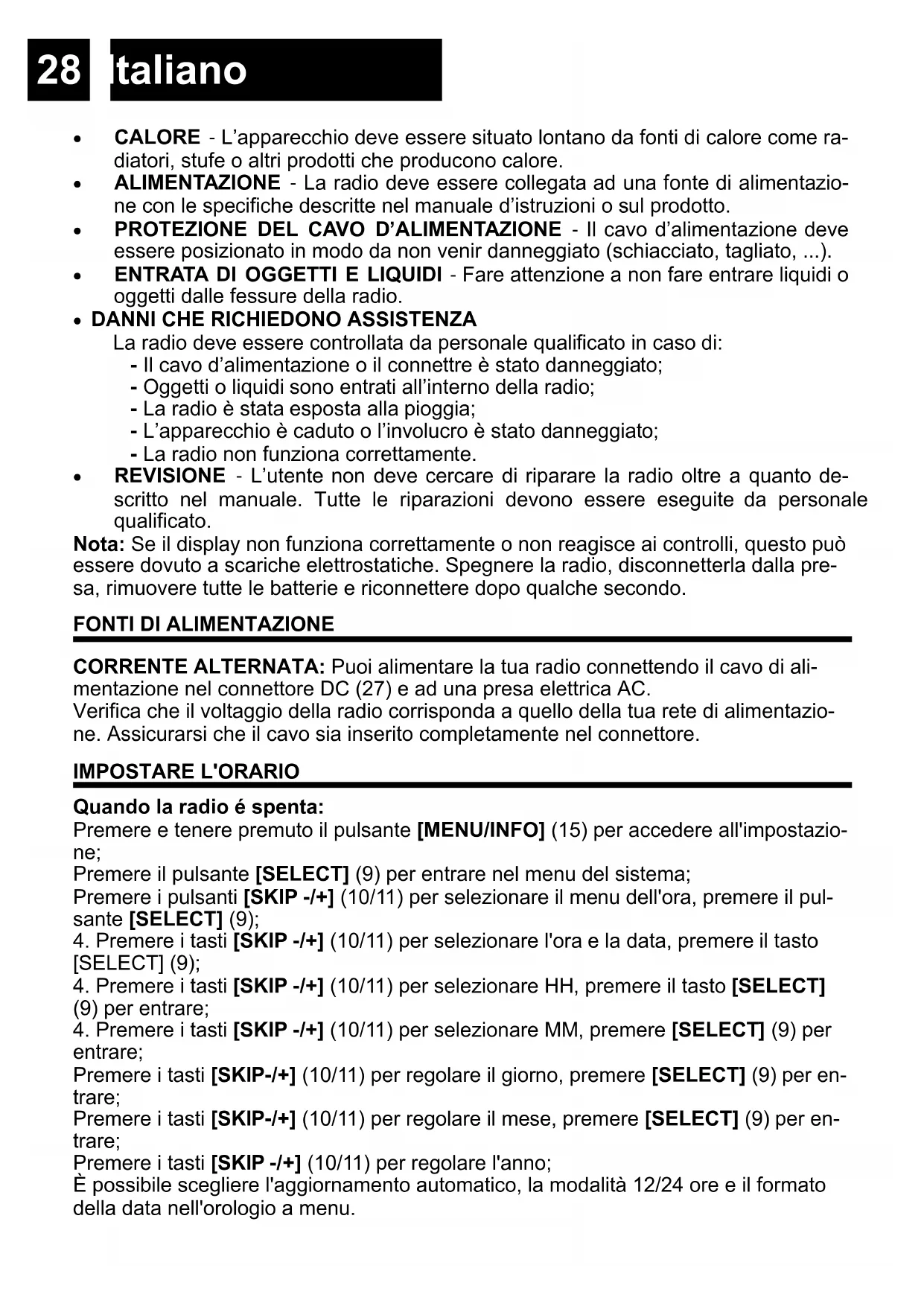 CORRENTE ALTERNATA: Puoi alimentare la tua radio connettendo il cavo di ali- mentazione nel connettore DC (27) e ad una presa elettrica AC. Verifica che il voltaggio della radio corrisponda a quello della tua rete di alimentazio- ne. Assicurarsi che il cavo sia inserito completamente nel connettore. IMPOSTARE L'ORARIO Quando la radio é spenta: Premere e tenere premuto il pulsante [MENU/INFO] (15) per accedere all'impostazio- ne; Premere il pulsante [SELECT] (9) per entrare nel menu del sistema; Premere i pulsanti [SKIP -/+] (10/11) per selezionare il menu dell'ora, premere il pul- sante [SELECT] (9);