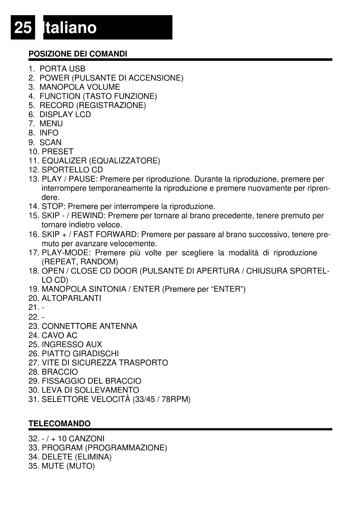 17. PLAY-MODE: Premere più volte per scegliere la modalità di riproduzione