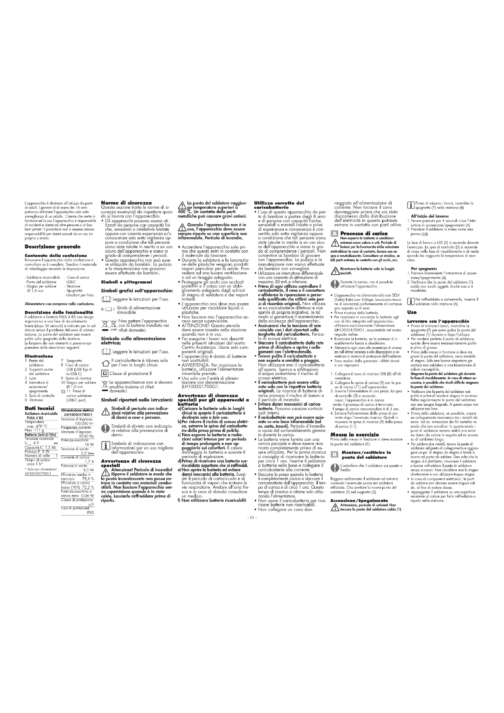 Tipo di protezione IPX0 Descrizione delle funzionalità Il saldatore a batteria PLKA 4 B3 con design ergonomico e una fase di riscaldamento breve (dopo 30 secondi) è indicato per la sal- datura senza il problema del cavo di alimen- tazione. La punta del saldatore può essere pulita sulla spugnetta della stazione. Le funzioni dei vari elementi si possono ap- prendere dalle descrizioni seguenti. Norme di sicurezza Questa sezione tratta le norme di si- curezza essenziali da rispettare quan- do si lavora con l’apparecchio.