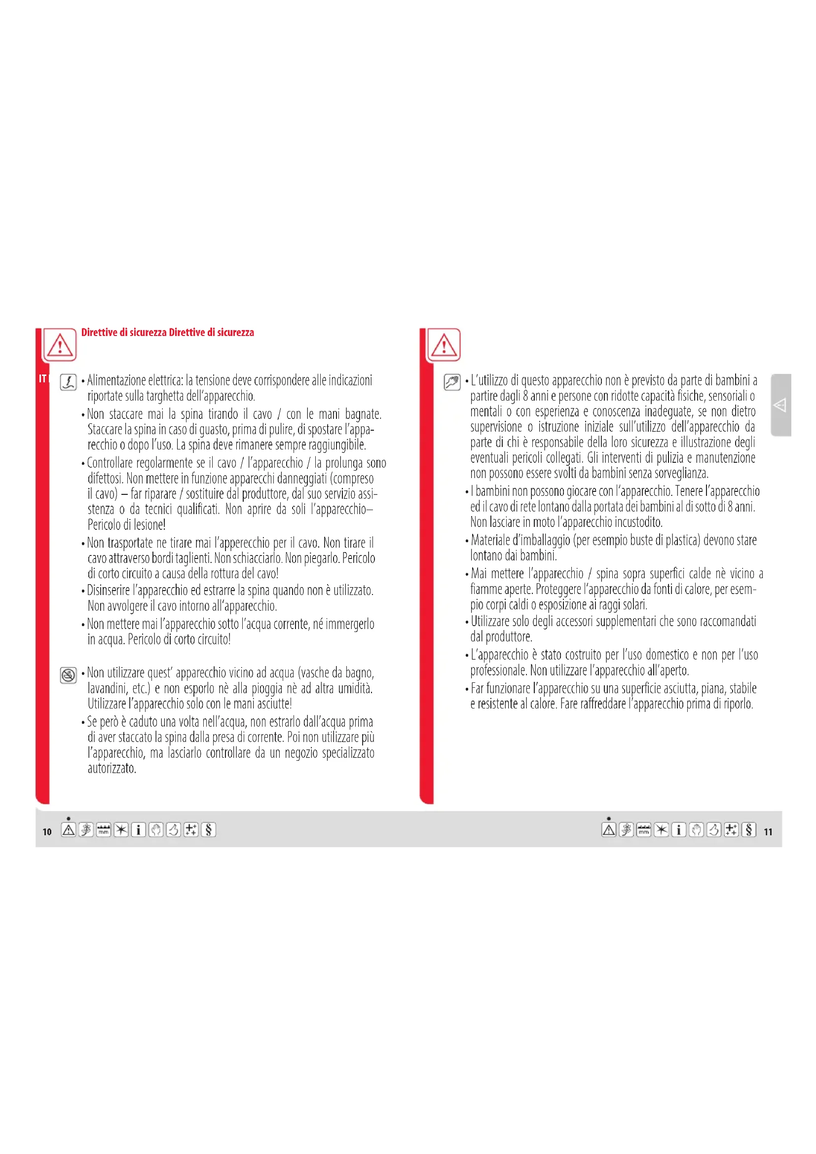 - L’utilizzo di questo apparecchio non è previsto da parte di bambini a partire dagli 8 anni e persone con ridotte capacità fisiche, sensoriali o mentali o con esperienza e conoscenza inadeguate, se non dietro supervisione o istruzione iniziale sull’utilizzo dell’apparecchio da parte di chi è responsabile della loro sicurezza e illustrazione degli eventuali pericoli collegati. Gli interventi di pulizia e manutenzione non possono essere svolti da bambini senza sorveglianza.