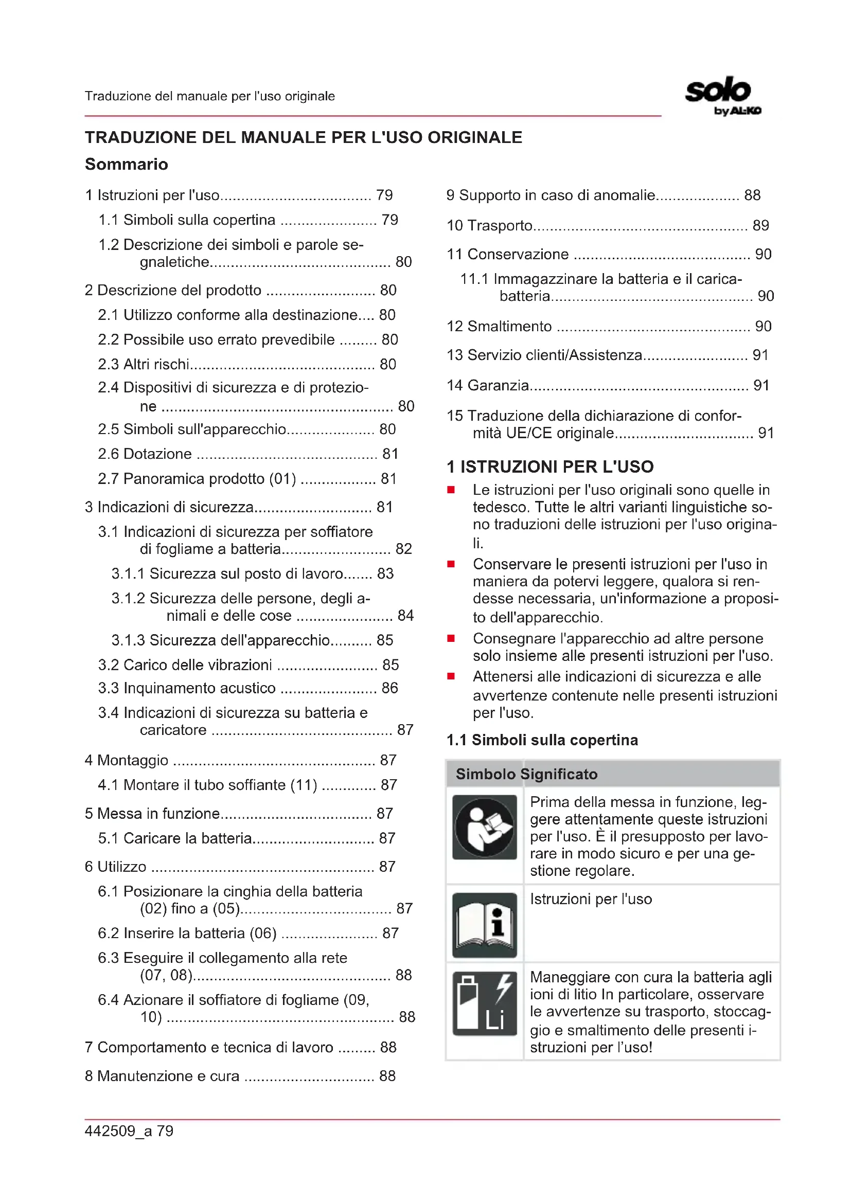 Queste istruzioni per l'uso descrivono un soffiato- re di fogliame manuale a batteria.