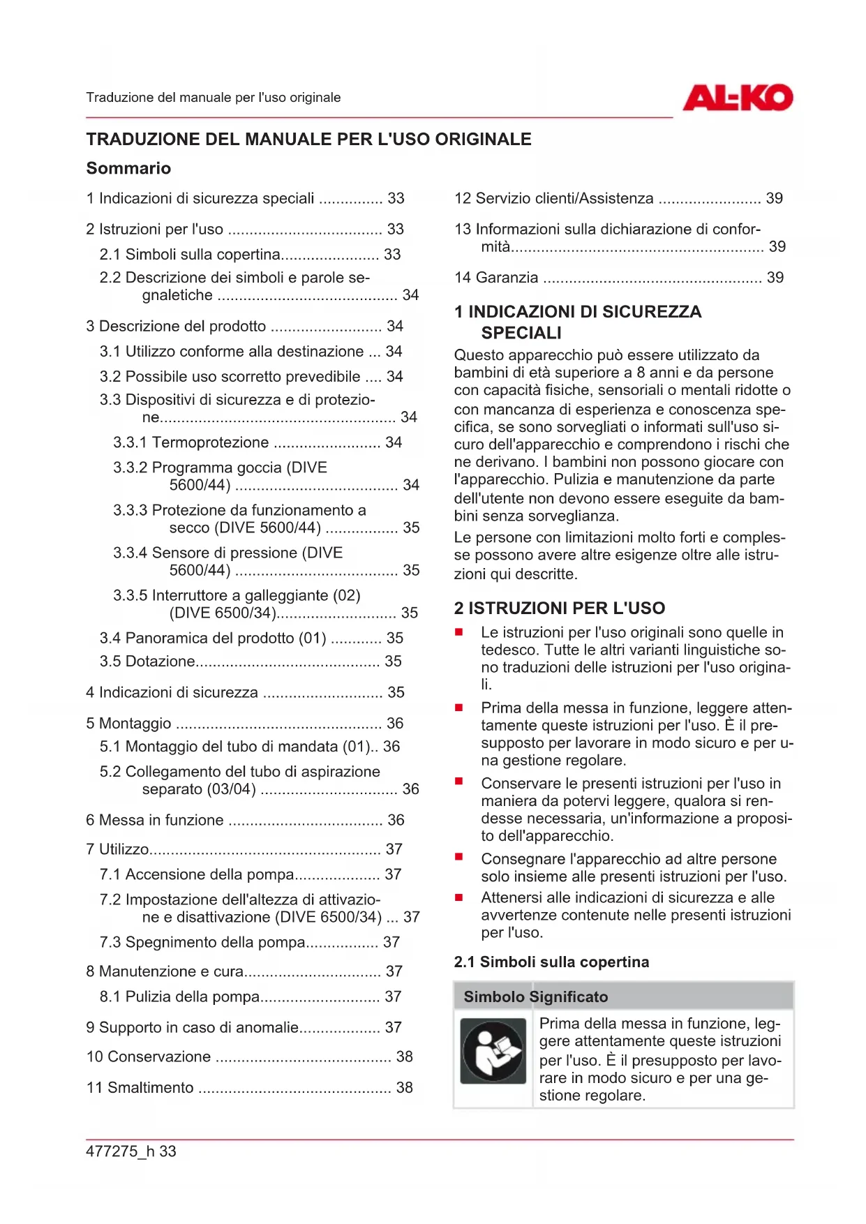 Scarica le istruzioni per il tuo Pompa in formato PDF gratuitamente! Trova il tuo manuale Dive 560044 - AL-KO e riprendi in mano il tuo dispositivo elettronico. In questa pagina sono pubblicati tutti i documenti necessari per l'utilizzo del tuo dispositivo. Dive 560044 del marchio AL-KO.