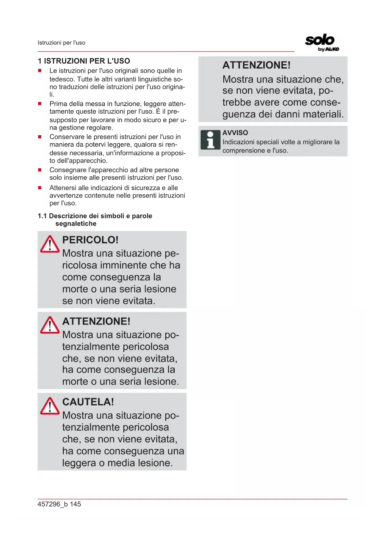 segnaletiche PERICOLO! Mostra una situazione pe- ricolosa imminente che ha come conseguenza la morte o una seria lesione se non viene evitata. ATTENZIONE! Mostra una situazione po- tenzialmente pericolosa che, se non viene evitata, ha come conseguenza la morte o una seria lesione. CAUTELA! Mostra una situazione po- tenzialmente pericolosa che, se non viene evitata, ha come conseguenza una leggera o media lesione. ATTENZIONE! Mostra una situazione che, se non viene evitata, po- trebbe avere come conse- guenza dei danni materiali. AVVISO Indicazioni speciali volte a migliorare la comprensione e l'uso.IT 146 Robolinho 4100 Descrizione del prodotto