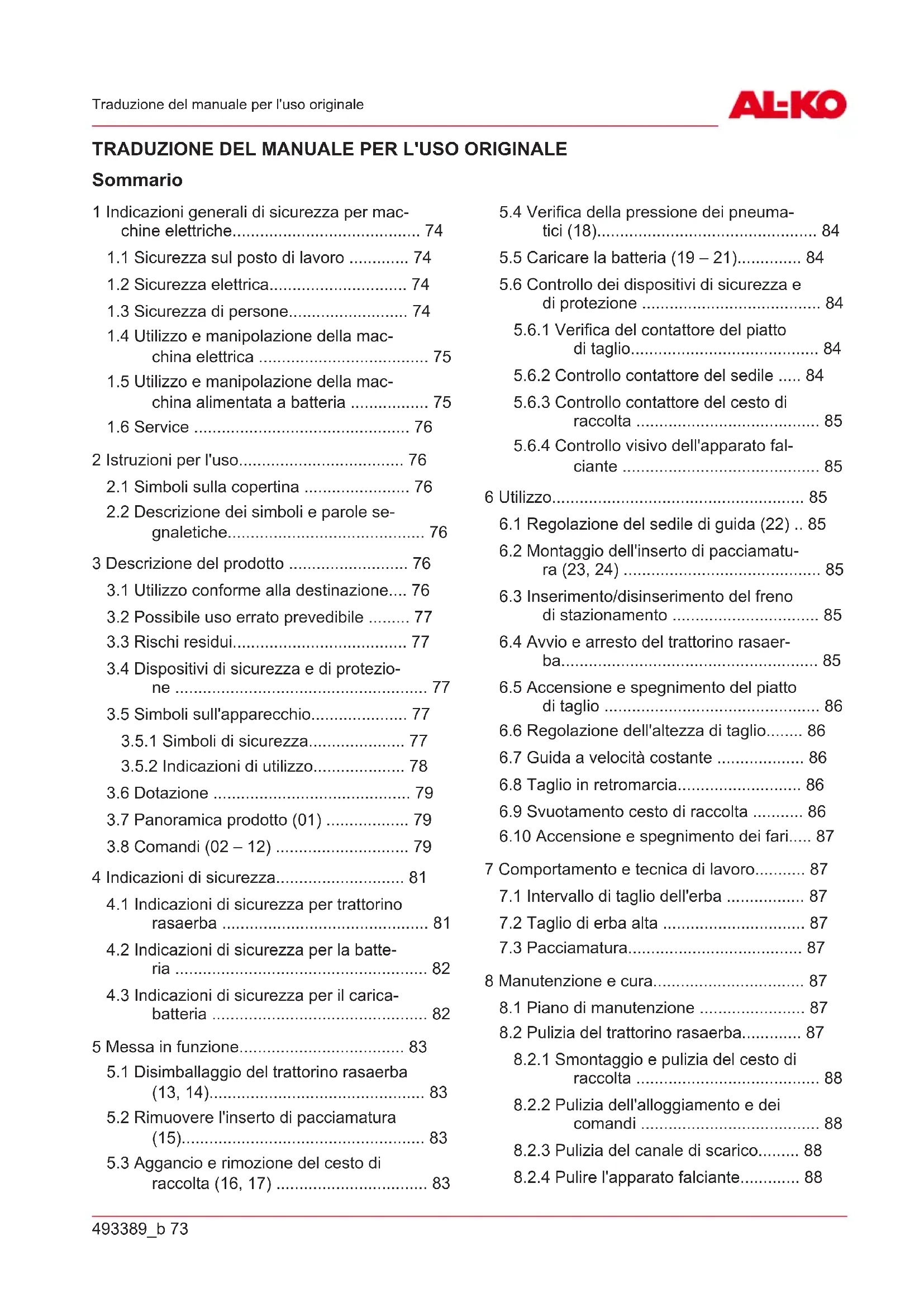 Sommario 1 Indicazioni generali di sicurezza per mac- chine elettriche......................................... 74