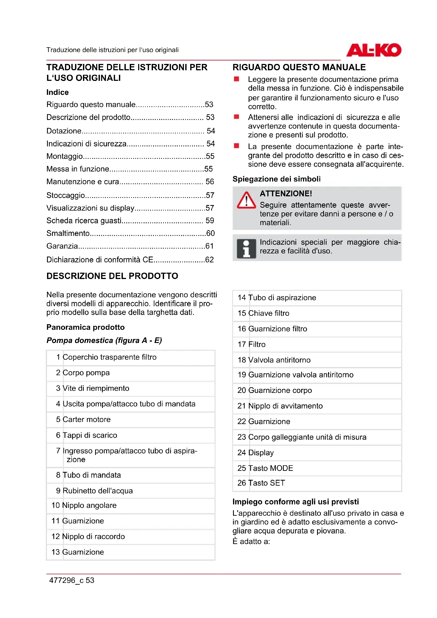 Nella presente documentazione vengono descritti diversi modelli di apparecchio. Identificare il pro- prio modello sulla base della targhetta dati. Panoramica prodotto Pompa domestica (figura A - E) 1 Coperchio trasparente filtro 2 Corpo pompa 3 Vite di riempimento 4 Uscita pompa/attacco tubo di mandata 5 Carter motore 6 Tappi di scarico 7 Ingresso pompa/attacco tubo di aspira- zione 8 Tubo di mandata 9 Rubinetto dell'acqua 10 Nipplo angolare 11 Guarnizione 12 Nipplo di raccordo 13 Guarnizione 14 Tubo di aspirazione 15 Chiave filtro 16 Guarnizione filtro 17 Filtro 18 Valvola antiritorno 19 Guarnizione valvola antiritorno 20 Guarnizione corpo 21 Nipplo di avvitamento 22 Guarnizione 23 Corpo galleggiante unità di misura 24 Display 25 Tasto MODE 26 Tasto SET Impiego conforme agli usi previsti L'apparecchio è destinato all'uso privato in casa e in giardino ed è adatto esclusivamente a convo- gliare acqua depurata e piovana. È adatto a:it Descrizione del prodotto