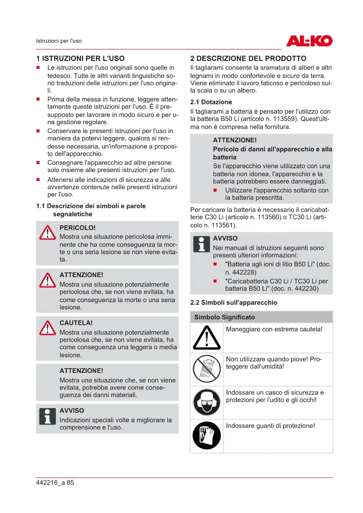 Il tagliarami a batteria è pensato per l'utilizzo con la batteria B50 Li (articolo n. 113559). Quest'ulti- ma non è compresa nella fornitura. ATTENZIONE! Pericolo di danni all'apparecchio e alla batteria Se l'apparecchio viene utilizzato con una batteria non idonea, l'apparecchio e la batteria potrebbero essere danneggiati.