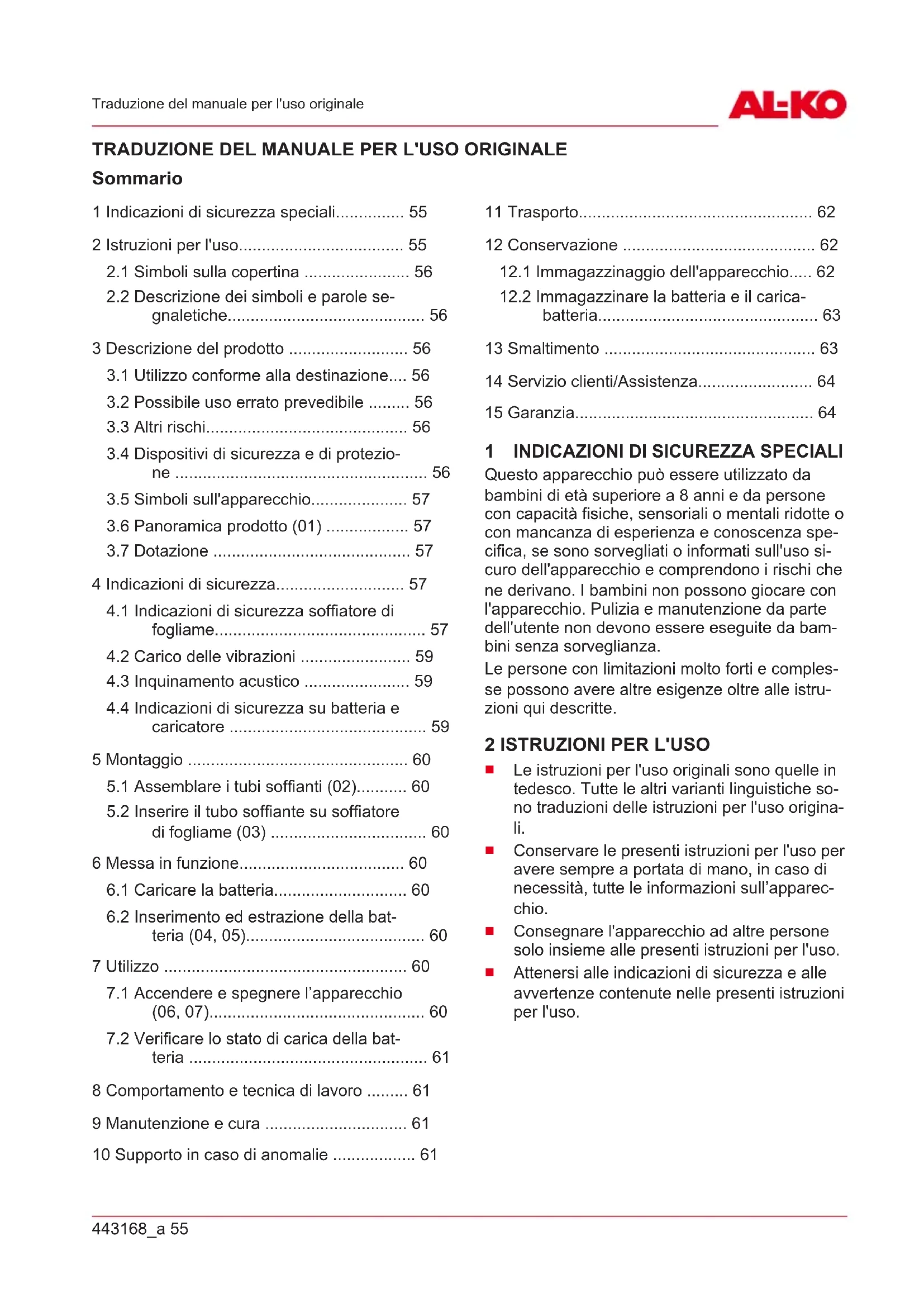 Sommario 1 Indicazioni di sicurezza speciali............... 55 2 Istruzioni per l'uso.................................... 55