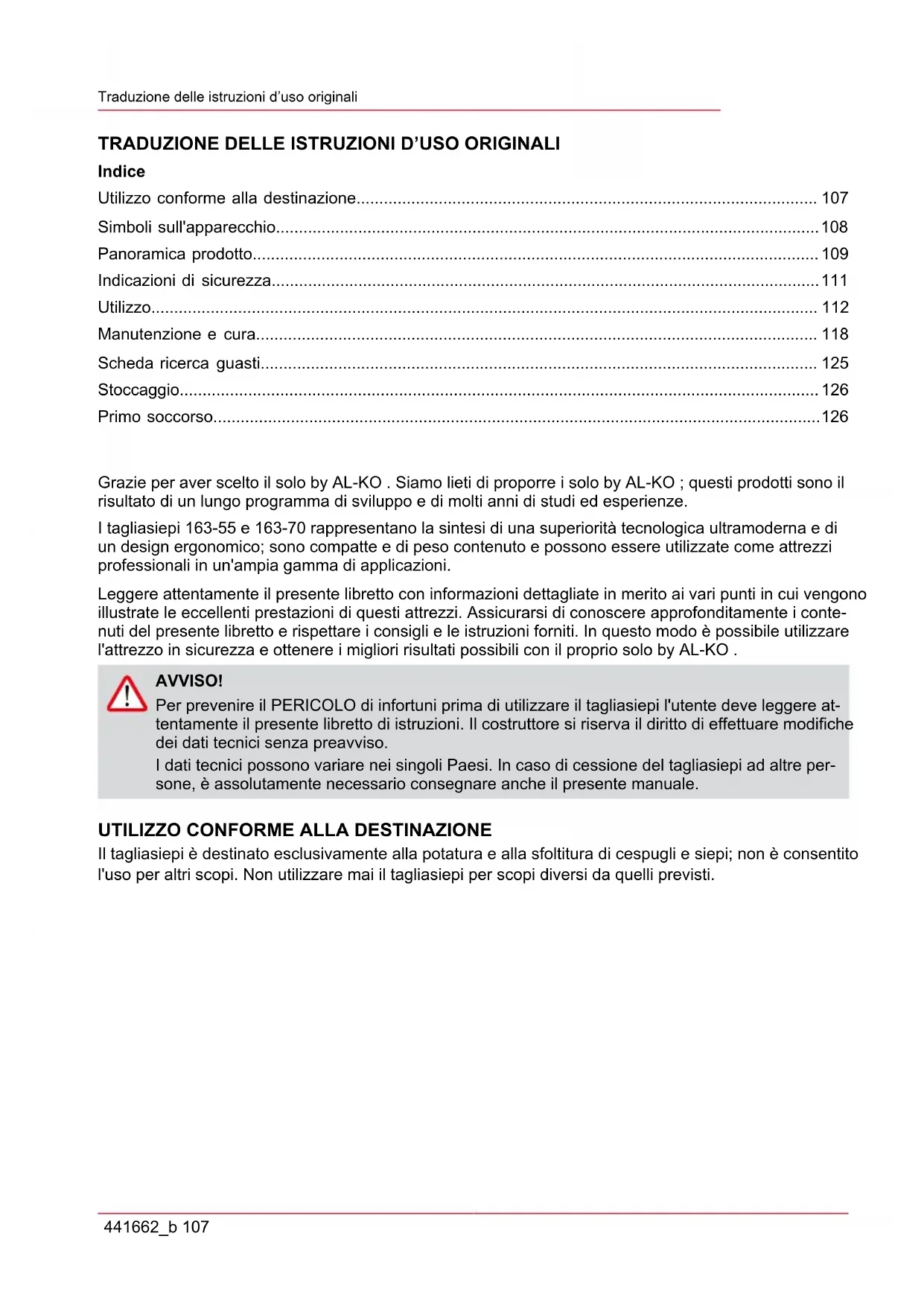 - Primo soccorso Grazie per aver scelto il solo by AL-KO . Siamo lieti di proporre i solo by AL-KO ; questi prodotti sono il risultato di un lungo programma di sviluppo e di molti anni di studi ed esperienze. I tagliasiepi 163-55 e 163-70 rappresentano la sintesi di una superiorità tecnologica ultramoderna e di un design ergonomico; sono compatte e di peso contenuto e possono essere utilizzate come attrezzi professionali in un'ampia gamma di applicazioni. Leggere attentamente il presente libretto con informazioni dettagliate in merito ai vari punti in cui vengono illustrate le eccellenti prestazioni di questi attrezzi. Assicurarsi di conoscere approfonditamente i conte- nuti del presente libretto e rispettare i consigli e le istruzioni forniti. In questo modo è possibile utilizzare l'attrezzo in sicurezza e ottenere i migliori risultati possibili con il proprio solo by AL-KO . AVVISO! Per prevenire il PERICOLO di infortuni prima di utilizzare il tagliasiepi l'utente deve leggere at- tentamente il presente libretto di istruzioni. Il costruttore si riserva il diritto di effettuare modifiche dei dati tecnici senza preavviso. I dati tecnici possono variare nei singoli Paesi. In caso di cessione del tagliasiepi ad altre per- sone, è assolutamente necessario consegnare anche il presente manuale. p. 126