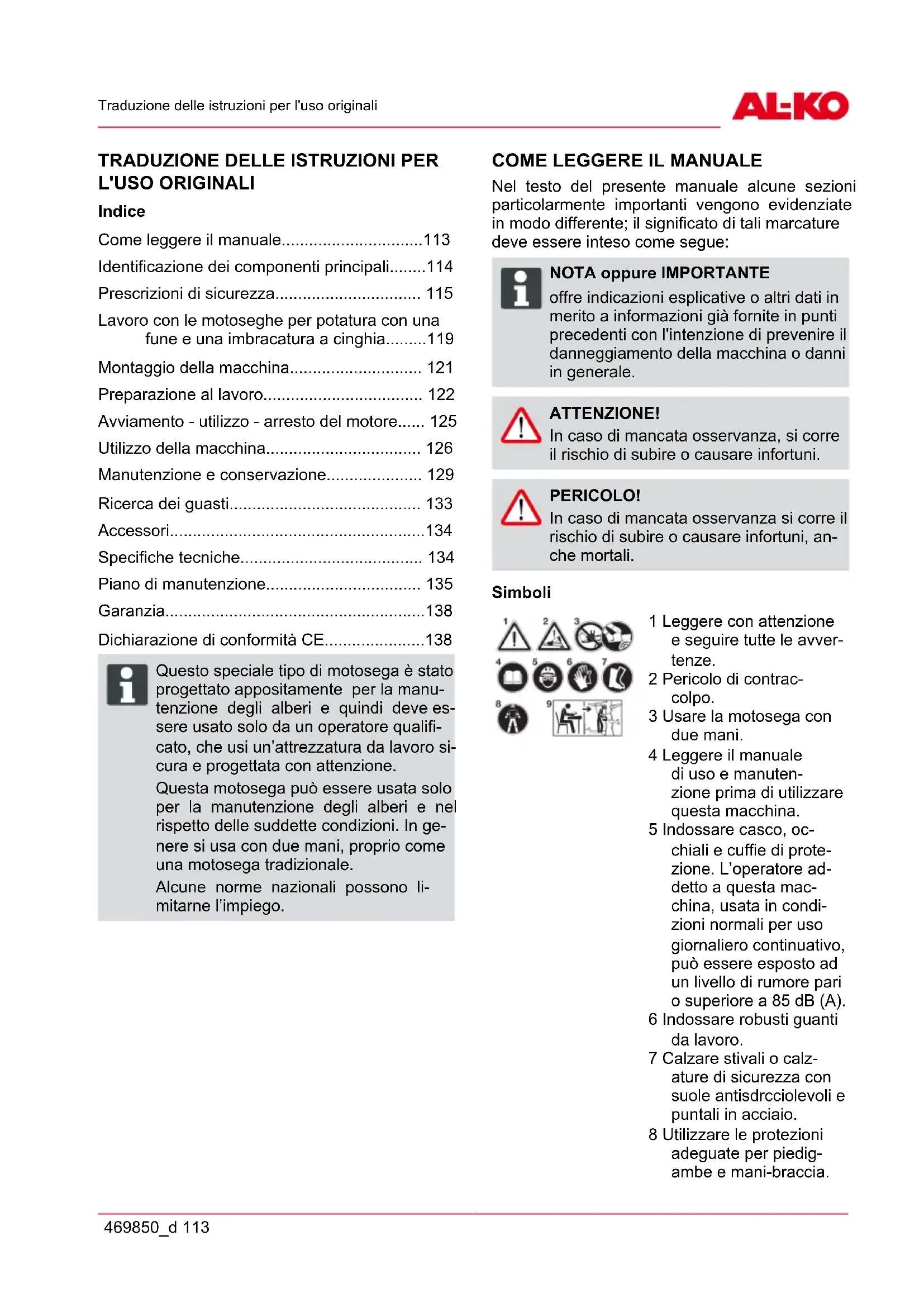 - Dichiarazione di conformità CE ADVICE Questo speciale tipo di motosega è stato progettato appositamente per la manu- tenzione degli alberi e quindi deve es- sere usato solo da un operatore qualifi- cato, che usi un’attrezzatura da lavoro si- cura e progettata con attenzione. Questa motosega può essere usata solo per la manutenzione degli alberi e nel rispetto delle suddette condizioni. In ge- nere si usa con due mani, proprio come una motosega tradizionale. Alcune norme nazionali possono li- mitarne l’impiego. p. 138