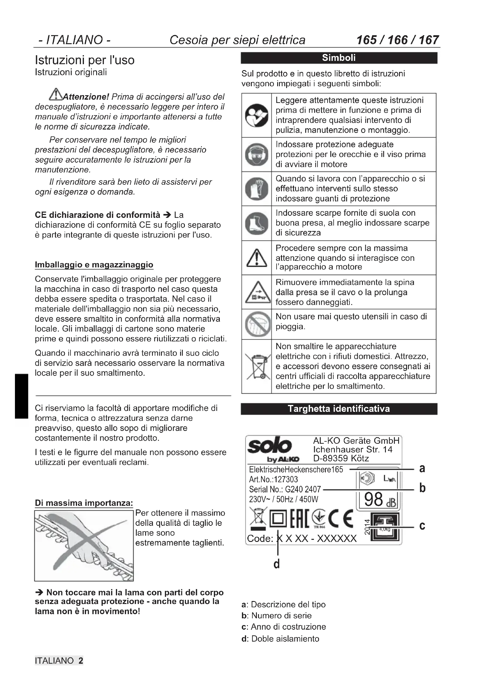 Fig. 14- ITALIANO - Cesoia per siepi elettrica 165 / 166 / 167 ITALIANO 2 Istruzioni per l'uso Istruzioni originali Attenzione! Prima di accingersi all’uso del decespugliatore, è necessario leggere per intero il manuale d’istruzioni e importante attenersi a tutte le norme di sicurezza indicate. Per conservare nel tempo le migliori prestazioni del decespugliatore, è necessario seguire accuratamente le istruzioni per la manutenzione. Il rivenditore sarà ben lieto di assistervi per ogni esigenza o domanda. CE dichiarazione di conformità Î La dichiarazione di conformità CE su foglio separato è parte integrante di queste istruzioni per l'uso. Imballaggio e magazzinaggio Conservate l'imballaggio originale per proteggere la macchina in caso di trasporto nel caso questa debba essere spedita o trasportata. Nel caso il materiale dell'imballaggio non sia più necessario, deve essere smaltito in conformità alla normativa locale. Gli imballaggi di cartone sono materie prime e quindi possono essere riutilizzati o riciclati. Quando il macchinario avrà terminato il suo ciclo di servizio sarà necessario osservare la normativa locale per il suo smaltimento.