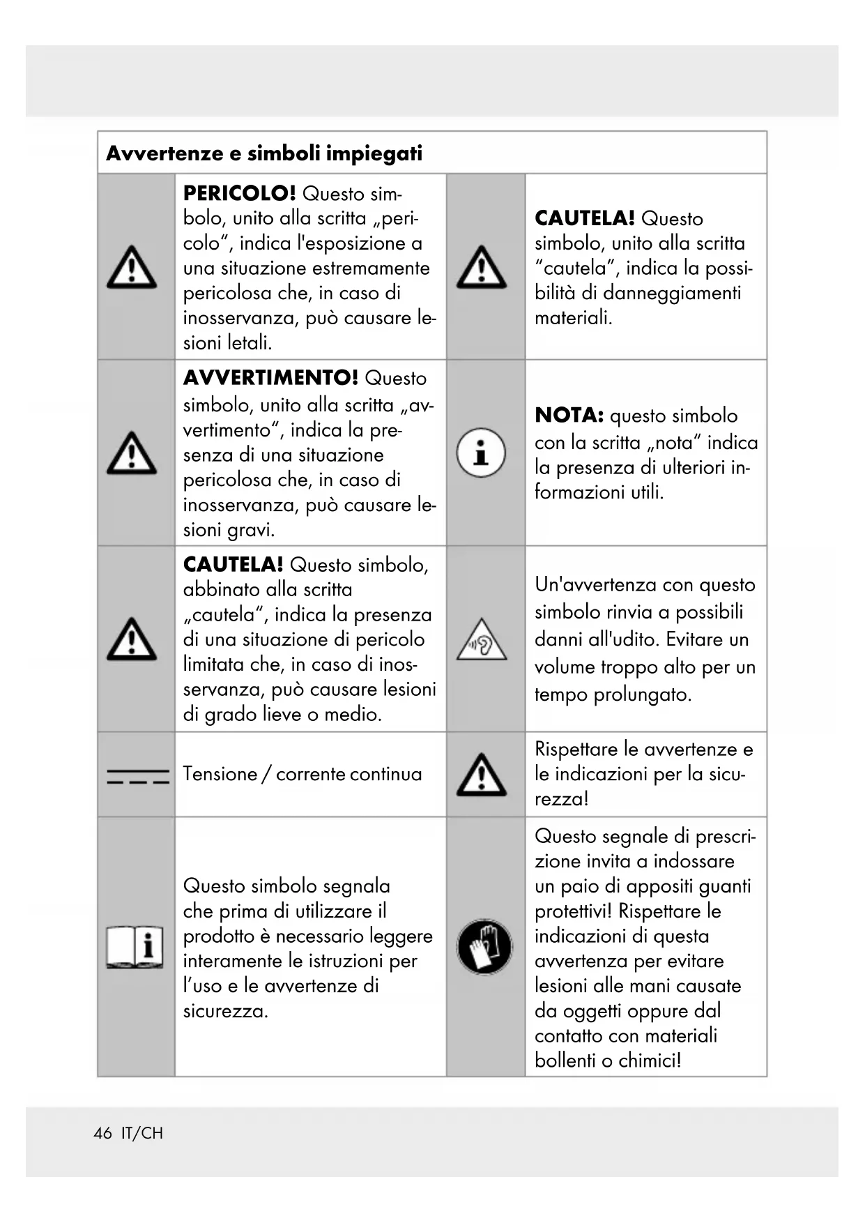 .............. Pagina 56 Eliminazione lista dei collegamenti ................................................................ Pagina 56 Collegare le cuffie al cavo audio ................................................................... Pagina 57 Come indossare le cuffie ................................................................................. Pagina 57 Funzioni tasti della cuffia durante la riproduzione audio ............................. Pagina 57 Tasti funzionali delle cuffie per l‘utilizzo con microfono ............................... Pagina 58 Pulizia ............................................................................................................. Pagina 60 Conservazione in caso di non utilizzo ............................... Pagina 60 Risoluzione dei problemi ............................................................... Pagina 60 Smaltimento .............................................................................................. Pagina 61 Dichiarazione di conformità UE semplificata .............. Pagina 62 Garanzia ...................................................................................................... Pagina 62 Gestione dei casi in garanzia ......................................................................... Pagina 63 Assistenza ........................................................................................................ Pagina 6446 IT/CH Avvertenze e simboli impiegati PERICOLO! Questo sim- bolo, unito alla scritta „peri- colo“, indica l'esposizione a una situazione estremamente pericolosa che, in caso di inosservanza, può causare le- sioni letali. CAUTELA! Questo simbolo, unito alla scritta “cautela”, indica la possi- bilità di danneggiamenti materiali. AVVERTIMENTO! Questo simbolo, unito alla scritta „av- vertimento“, indica la pre- senza di una situazione pericolosa che, in caso di inosservanza, può causare le- sioni gravi. NOTA: questo simbolo con la scritta „nota“ indica la presenza di ulteriori in- formazioni utili. CAUTELA! Questo simbolo, abbinato alla scritta „cautela“, indica la presenza di una situazione di pericolo limitata che, in caso di inos- servanza, può causare lesioni di grado lieve o medio. Un'avvertenza con questo simbolo rinvia a possibili danni all'udito. Evitare un volume troppo alto per un tempo prolungato. Tensione / corrente continua Rispettare le avvertenze e le indicazioni per la sicu- rezza! Questo simbolo segnala che prima di utilizzare il prodotto è necessario leggere interamente le istruzioni per l’uso e le avvertenze di sicurezza. Questo segnale di prescri- zione invita a indossare un paio di appositi guanti protettivi! Rispettare le indicazioni di questa avvertenza per evitare lesioni alle mani causate da oggetti oppure dal contatto con materiali bollenti o chimici!47 IT/CH Avvertenze e simboli impiegati Il marchio CE garantisce la conformità con le Direttive UE specifiche per il prodotto. Cuffie stereo Bluetooth