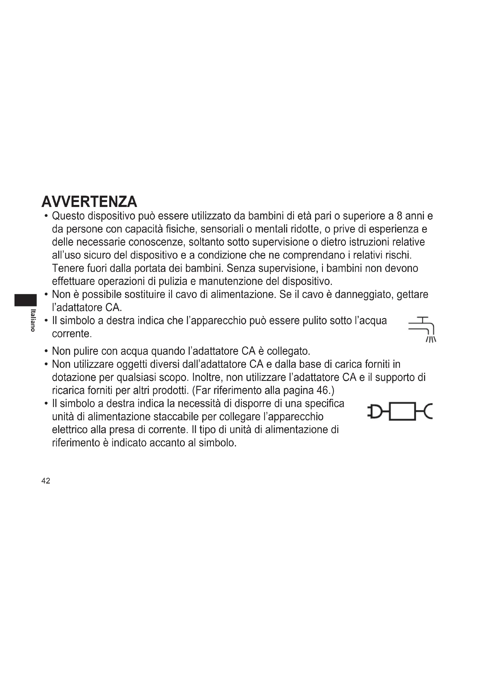 Non utilizzare oggetti diversi dall’adattatore CA e dalla base di carica forniti in dotazione per qualsiasi scopo. Inoltre, non utilizzare l’adattatore CA e il supporto di ricarica forniti per altri prodotti. (Far riferimento alla pagina 46.)