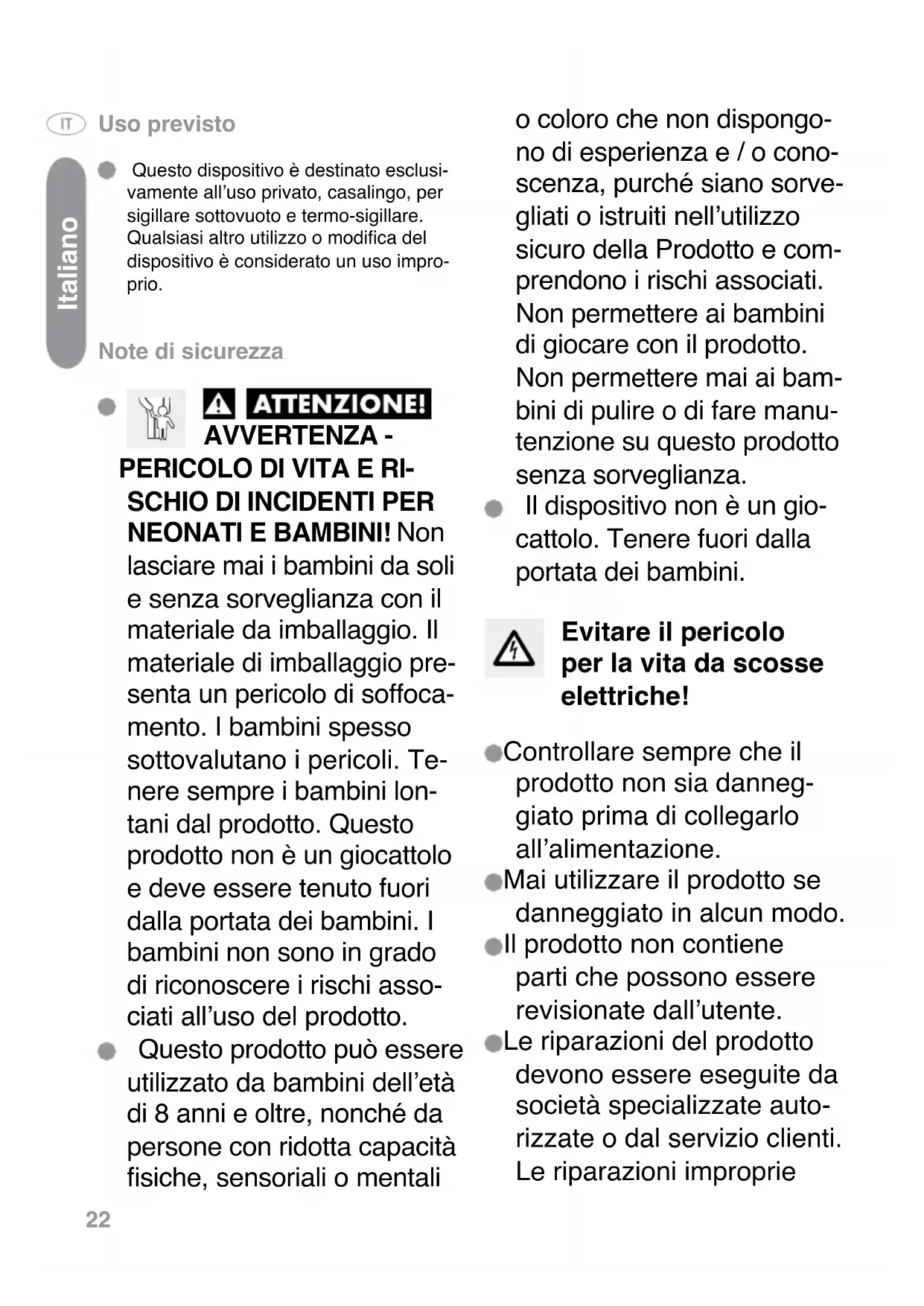 Grain de café 6 - 9 mois 2 - 3 ans Français22 Uso previsto Questo dispositivo è destinato esclusi- vamente all’uso privato, casalingo, per sigillare sottovuoto e termo-sigillare. Qualsiasi altro utilizzo o modica del dispositivo è considerato un uso impro- prio. Note di sicurezza AVVERTENZA -