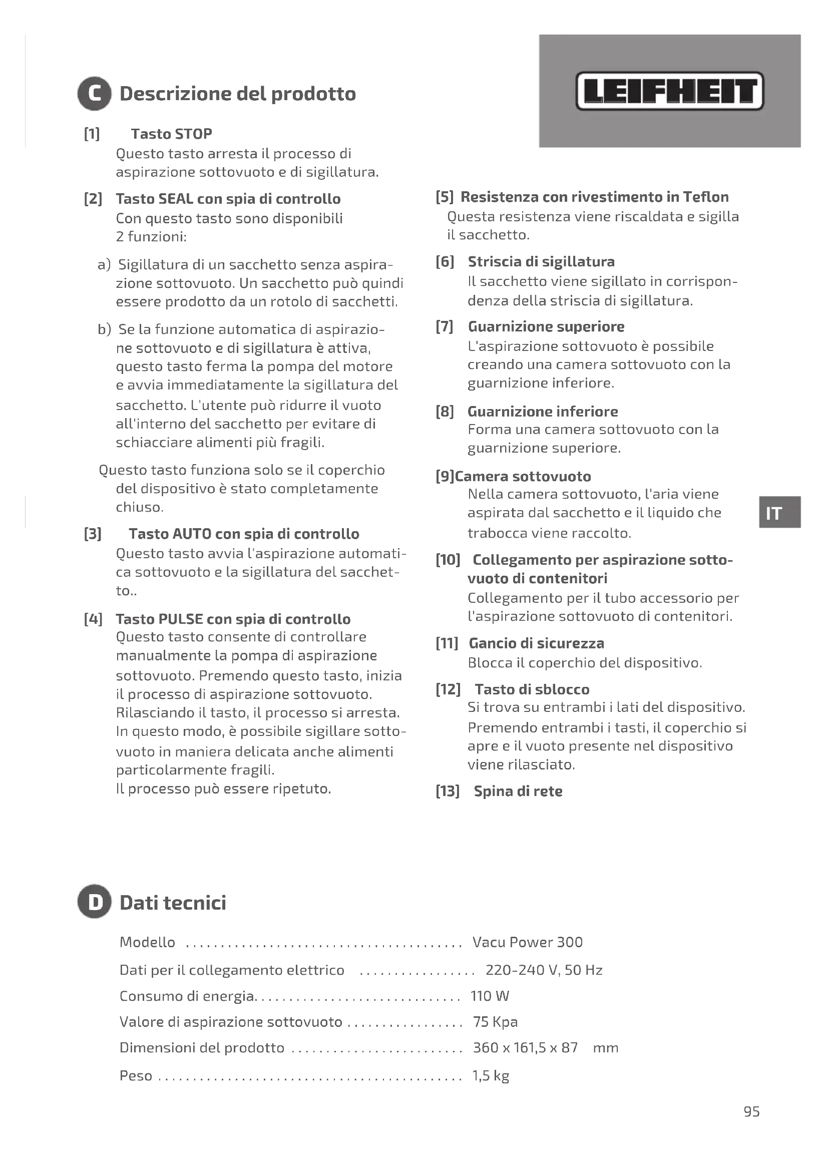 Dotazione ATTENZIONE Indicazionediunasituazionepossi- bilmentepericolosachepuòcausare lesionidilieveentità. AVVERTENZA Indicazionediunasituazionepossi- bilmentepericolosachepuòcausare dannimateriali. Incasodidomandeesuggerimenti,ilnostroServizio diassistenzaLeifheitèavostradisposizione. Leifheitstraße1,56377Nassau,Germany Número de teléfono internazionale (a pagamento): (lun-ven:07:00-17:00Uhr) Tel.: 004926049770 Fax: 00492604977300 E-mail: info@leifheit.com www.leifheit.com95 Modello........................................VacuPower300 Datiperilcollegamentoelettrico .................220-240V,50Hz Consumodienergia..............................110W Valorediaspirazionesottovuoto .................75Kpa Dimensionidelprodotto .........................360x161,5x87 mm Peso ............................................1,5kg [1] Tasto STOP Questotastoarrestailprocessodi aspirazionesottovuotoedisigillatura. [2] TastoSEALconspiadicontrollo Conquestotastosonodisponibili 2funzioni: a)Sigillaturadiunsacchettosenzaaspira- zionesottovuoto.Unsacchettopuòquindi essereprodottodaunrotolodisacchetti. b)Selafunzioneautomaticadiaspirazio- nesottovuotoedisigillaturaèattiva, questotastofermalapompadelmotore eavviaimmediatamentelasigillaturadel sacchetto.L'utentepuòridurreilvuoto all'internodelsacchettoperevitaredi schiacciarealimentipiùfragili. Questotastofunzionasoloseilcoperchio deldispositivoèstatocompletamente chiuso. [3] TastoAUTOconspiadicontrollo Questotastoavvial'aspirazioneautomati- casottovuotoelasigillaturadelsacchet- to.. [4] TastoPULSEconspiadicontrollo Questotastoconsentedicontrollare manualmentelapompadiaspirazione sottovuoto.Premendoquestotasto,inizia ilprocessodiaspirazionesottovuoto. Rilasciandoiltasto,ilprocessosiarresta. Inquestomodo,èpossibilesigillaresotto- vuotoinmanieradelicataanchealimenti particolarmentefragili. Ilprocessopuòessereripetuto.