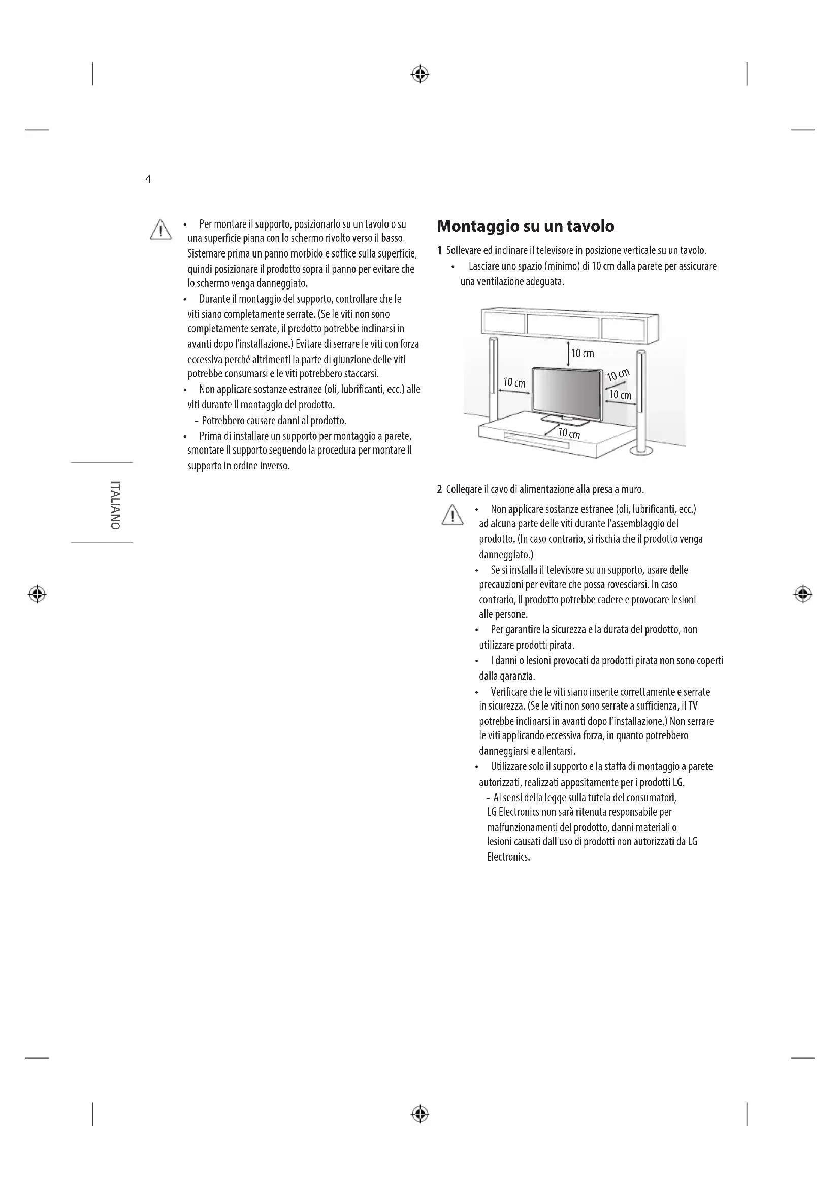 - Utilizzare solo il supporto e la staffa di montaggio a parete autorizzati, realizzati appositamente per i prodotti LG. - Ai sensi della legge sulla tutela dei consumatori, LG Electronics non sarà ritenuta responsabile per malfunzionamenti del prodotto, danni materiali o lesioni causati dall'uso di prodotti non autorizzati da LG Electronics.5 ITALIANO Fissaggio del TV su un tavolo (in base al modello) AVVISO: È necessario fissare il TV a un tavolo per evitare potenziali cause di lesioni o danni al prodotto dovute al movimento in avanti o indietro. Tipo A 4 viti (Non in dotazione con il TV) Tavolo Supporto