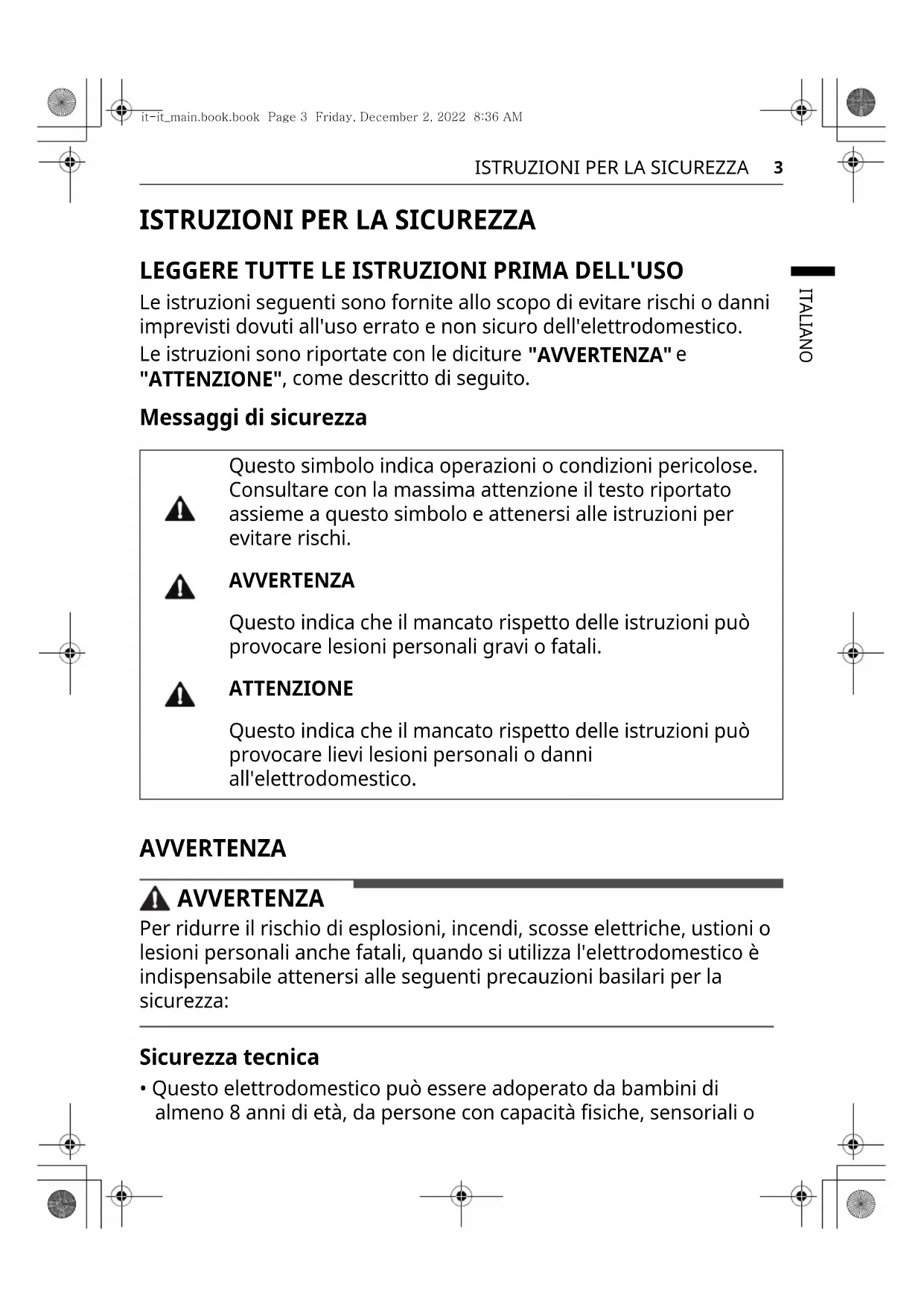 - Questo elettrodomestico può essere adoperato da bambini di almeno 8 anni di età, da persone con capacità fisiche, sensoriali o Questo simbolo indica operazioni o condizioni pericolose. Consultare con la massima attenzione il testo riportato assieme a questo simbolo e attenersi alle istruzioni per evitare rischi. AVVERTENZA Questo indica che il mancato rispetto delle istruzioni può provocare lesioni personali gravi o fatali. ATTENZIONE Questo indica che il mancato rispetto delle istruzioni può provocare lievi lesioni personali o danni all'elettrodomestico. it-it_main.book.book Page 3 Friday, December 2, 2022 8:36 AM4