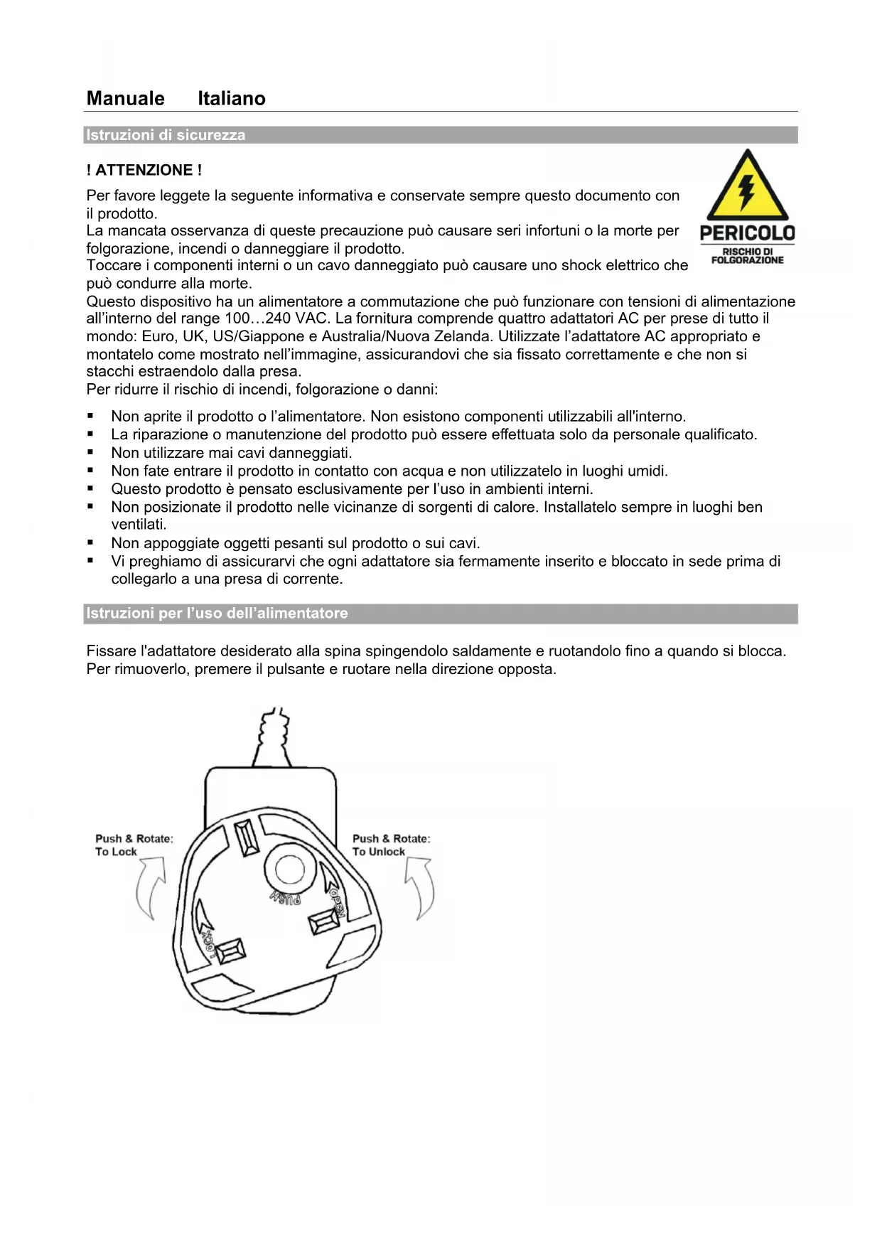inclus aux unités de splitter et de récepteur, en utilisant le câble émetteur IR avec le port IR Out du splitter et le récepteur IR avec le port IR in des récepteurs. Veillez à ce que le câble émetteur soit en face du port IR qui sera contrôlé, tandis que les récepteurs IR sont en ligne de mire de la télécommande IR. Dépannage Acune image à l’écran. Il a été constaté qu'il existe des différences significatives dans les longueurs/types de câbles et même les ports d'entrée qui peuvent être utilisés sur différentes marques d'écrans utilisant des résolutions HDMI. Si vous rencontrez des problèmes, veuillez suivre les étapes suivantes : Réinitialisez le splitter extender ou l'unité de réception à l'aide du bouton poussoir de réinitialisation. Essayez un autre port d'entrée sur l'écran. Réduisez la longueur du câble sur l'entrée et la sortie à 1m. Essayez un autre type de câble HDMI de 1 m. Vérifiez que la fiche et la prise DC utilisées par l'alimentation externe sont bien connectées. Vérifiez que le câble Cat.6 ou supérieur est correctement connecté. Eteignez tous les appareils, puis mettez-les sous tension dans cet ordre: d'abord le répartiteur, puis l'écran et enfin la source. Pour certains appareils HDMI, il peut être utile de débrancher et de rebrancher leur connexion HDMI afin de réinitialiser l'échange et la reconnaissance HDMI. Réduisez la longueur du câble Cat.6 ou HDMI utilisé ou utilisez un câble de meilleure qualité. Lindy vérifie et teste régulièrement sa gamme de produits afin de garantir une compatibilité et des performances maximales. Pour obtenir la version la plus récente de ce manuel, veuillez vous reporter au site Web de Lindy, recherchez le numéro de produit concerné et trouvez le manuel dans la section Téléchargements. Pour toute assistance supplémentaire, veuillez contacter votre équipe locale de support technique Lindy. Vous trouverez des informations détaillées sur le site Web de Lindy de votre pays.Manuale Italiano Istruzioni di sicurezza ! ATTENZIONE ! Per favore leggete la seguente informativa e conservate sempre questo documento con il prodotto. La mancata osservanza di queste precauzione può causare seri infortuni o la morte per folgorazione, incendi o danneggiare il prodotto. Toccare i componenti interni o un cavo danneggiato può causare uno shock elettrico che può condurre alla morte. Questo dispositivo ha un alimentatore a commutazione che può funzionare con tensioni di alimentazione all’interno del range 100…240 VAC. La fornitura comprende quattro adattatori AC per prese di tutto il mondo: Euro, UK, US/Giappone e Australia/Nuova Zelanda. Utilizzate l’adattatore AC appropriato e montatelo come mostrato nell’immagine, assicurandovi che sia fissato correttamente e che non si stacchi estraendolo dalla presa. Per ridurre il rischio di incendi, folgorazione o danni: Non aprite il prodotto o l’alimentatore. Non esistono componenti utilizzabili all'interno. La riparazione o manutenzione del prodotto può essere effettuata solo da personale qualificato. Non utilizzare mai cavi danneggiati. Non fate entrare il prodotto in contatto con acqua e non utilizzatelo in luoghi umidi. Questo prodotto è pensato esclusivamente per l’uso in ambienti interni. Non posizionate il prodotto nelle vicinanze di sorgenti di calore. Installatelo sempre in luoghi ben ventilati. Non appoggiate oggetti pesanti sul prodotto o sui cavi. Vi preghiamo di assicurarvi che ogni adattatore sia fermamente inserito e bloccato in sede prima di collegarlo a una presa di corrente. Istruzioni per l’uso dell’alimentatore Fissare l'adattatore desiderato alla spina spingendolo saldamente e ruotandolo fino a quando si blocca. Per rimuoverlo, premere il pulsante e ruotare nella direzione opposta.Manuale Italiano Introduzione Grazie per aver acquistato lo Splitter Extender Cat.6 HDMI 4K60 4 Porte, 70m. Questo prodotto è stato progettato per fornire un funzionamento affidabile e sicuro. Beneficia di una garanzia LINDY di 2 anni e di un supporto tecnico gratuito a vita. Per assicurare un uso corretto, si prega di leggere attentamente questo manuale e conservarlo per riferimento futuro. Contenuto della confezione Splitter Extender HDMI 4K60 Cat.6 4 porte, 70m 4 Ricevitori HDMI Cat.6 Cavo emettitore IR, 1.2m 4 Cavi ricevitore IR, 1.2m 2 Staffe di montaggio del trasmettitore e viti 8 Staffe di montaggio del ricevitore e viti Alimentatore multi-country 12VDC 2A (UK, EU, US & AUS), Dimensione jack DC: 5.5/2.1mm Manuale Lindy Caratteristiche Consente di distribuire i segnali HDMI a un massimo di 4 schermi in più postazioni. Supporta risoluzioni fino a 4K@60Hz, con supporto aggiuntivo per l'HDR. È dotato di un'uscita HDMI loop-through sul trasmettitore per il controllo locale o il collegamento a cascata fino a 3 livelli nelle installazioni di maggiori dimensioni. Controllo tramite un telecomando IR dalle postazioni del ricevitore. Supporta Power over Cat.6 (PoC) ai ricevitori, è necessario un solo alimentatore per il suo funzionamento. Specifiche Standard interfaccia: HDMI 2.0 Larghezza di banda supportata: 18Gbps Distanza massima: 70m (229.66ft) Risoluzione massima: 3840x2160@60Hz 4:4:4 8bit Supporto HDCP: 2.2 Passaggio EDID: Pass-through Formati audio supportati: 2CH, fino a 5.1CH copiando l’EDID dall’uscita HDMI locale Supporto IR: 20-60KHz Chipset: GSV2006 & GSV5100 Materiale: Metallo Temperatura operativa: 0°C - 50°C (32°F - 122°F) Temperatura di stoccaggio: -10°C - 80°C (14°F - 176°F) Umidità: 5 - 90% RH (senza condensa) Assorbimento elettrico: Splitter Extender: 5.2W, Ricevitore: 1.6W Colore: Nero Connettori Ingresso trasmettitore: HDMI tipo A (Femmina) Uscita trasmettitore: 4 x RJ-45 (Femmina), HDMI Type A (Femmina), 3.5mm IR (Femmina) Ingresso ricevitore: RJ-45 (Femmina), 3.5mm IR (Femmina) Uscita ricevitore: HDMI Type A (Femmina)Manuale Italiano Panoramica sul prodotto Extender Splitter, Trasmettitor