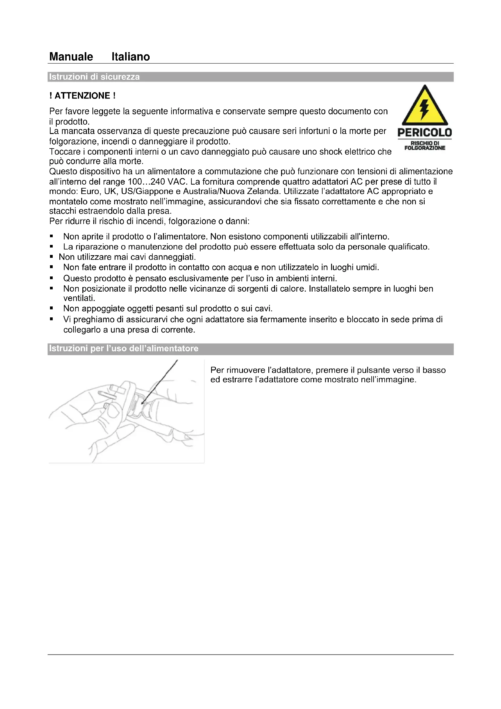 - Essayez de connecter le PC et l’écran avec une connexion directe pour vérifier que le signal vidéo soit bien affiché. Lindy vérifie et teste régulièrement sa gamme de produits pour assurer une compatibilité et une performance maximales. Pour une version plus récente de ce manuel, merci de vous référer au descriptif web de ce produit sur lindy.fr, dans la section « Manuel d’utilisation ».Manuale Italiano Istruzioni di sicurezza ! ATTENZIONE ! Per favore leggete la seguente informativa e conservate sempre questo documento con il prodotto. La mancata osservanza di queste precauzione può causare seri infortuni o la morte per folgorazione, incendi o danneggiare il prodotto. Toccare i componenti interni o un cavo danneggiato può causare uno shock elettrico che può condurre alla morte. Questo dispositivo ha un alimentatore a commutazione che può funzionare con tensioni di alimentazione all’interno del range 100…240 VAC. La fornitura comprende quattro adattatori AC per prese di tutto il mondo: Euro, UK, US/Giappone e Australia/Nuova Zelanda. Utilizzate l’adattatore AC appropriato e montatelo come mostrato nell’immagine, assicurandovi che sia fissato correttamente e che non si stacchi estraendolo dalla presa. Per ridurre il rischio di incendi, folgorazione o danni: