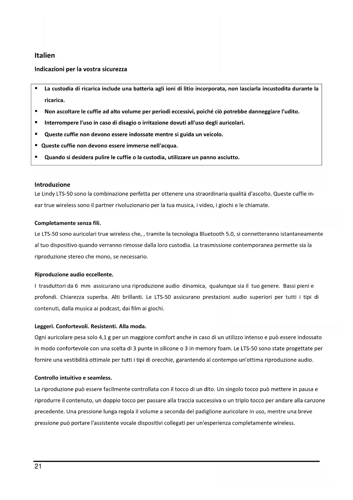 Introduzione Le Lindy LTS-50 sono la combinazione perfetta per ottenere una straordinaria qualità d'ascolto. Queste cuffie in- ear true wireless sono il partner rivoluzionario per la tua musica, i video, i giochi e le chiamate. Completamente senza fili. Le LTS-50 sono auricolari true wireless che, , tramite la tecnologia Bluetooth 5.0, si connetteranno istantaneamente al tuo dispositivo quando verranno rimosse dalla loro custodia. La trasmissione contemporanea permette sia la riproduzione stereo che mono, se necessario. Riproduzione audio eccellente. I trasduttori da 6 mm assicurano una riproduzione audio dinamica, qualunque sia il tuo genere. Bassi pieni e profondi. Chiarezza superba. Alti brillanti. Le LTS-50 assicurano prestazioni audio superiori per tutti i tipi di contenuti, dalla musica ai podcast, dai film ai giochi. Leggeri. Confortevoli. Resistenti. Alla moda. Ogni auricolare pesa solo 4,1 g per un maggiore comfort anche in caso di un utilizzo intenso e può essere indossato in modo confortevole con una scelta di 3 punte in silicone o 3 in memory foam. Le LTS-50 sono state progettate per fornire una vestibilità ottimale per tutti i tipi di orecchie, garantendo al contempo un'ottima riproduzione audio. Controllo intuitivo e seamless. La riproduzione può essere facilmente controllata con il tocco di un dito. Un singolo tocco può mettere in pausa e riprodurre il contenuto, un doppio tocco per passare alla traccia successiva o un triplo tocco per andare alla canzone precedente. Una pressione lunga regola il volume a seconda del padiglione auricolare in uso, mentre una breve pressione può portare l'assistente vocale dispositivi collegati per un'esperienza completamente wireless.22 Contenuto della confezione