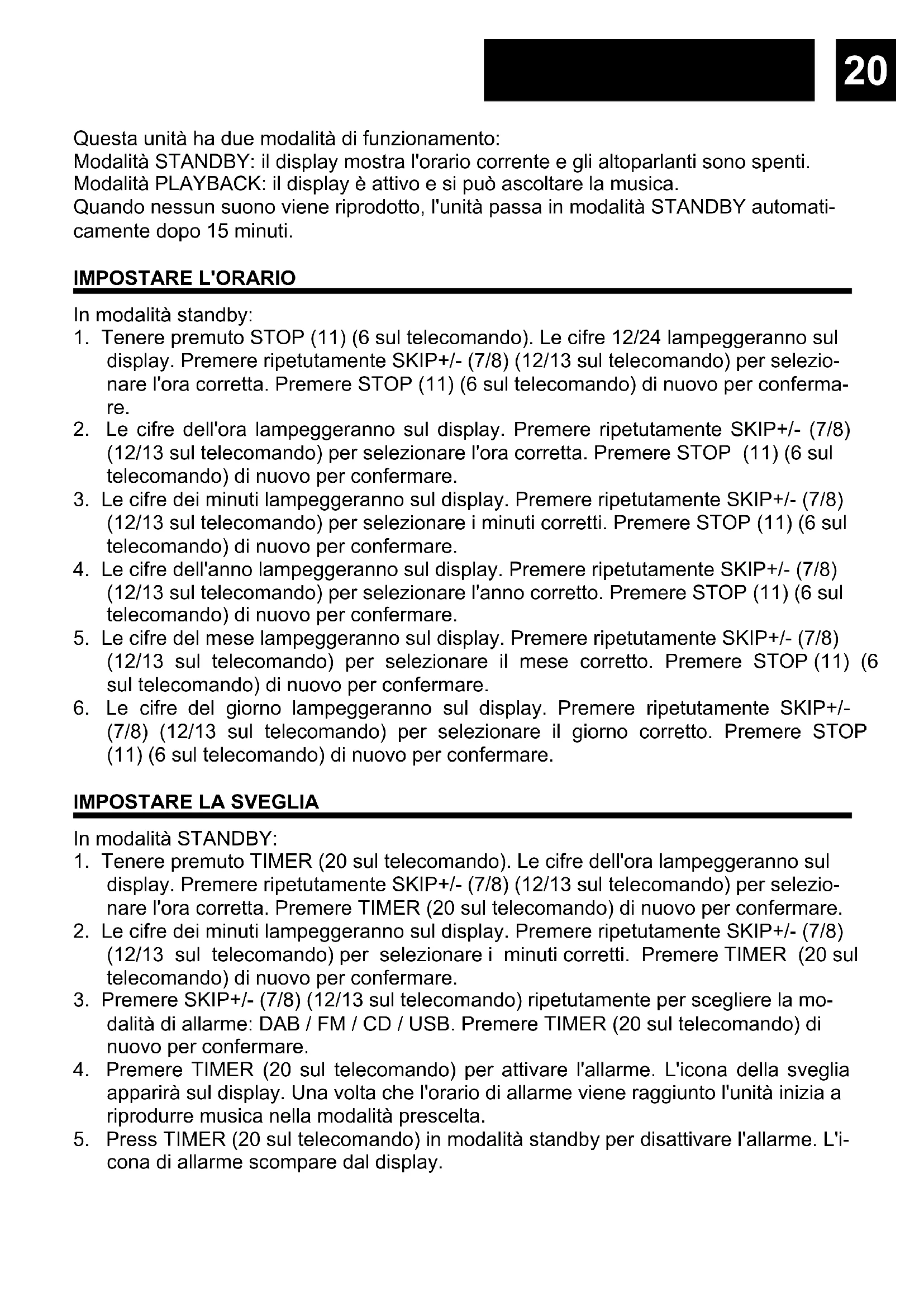 dalità di allarme: DAB / FM / CD / USB. Premere TIMER (20 sul telecomando) di nuovo per confermare.