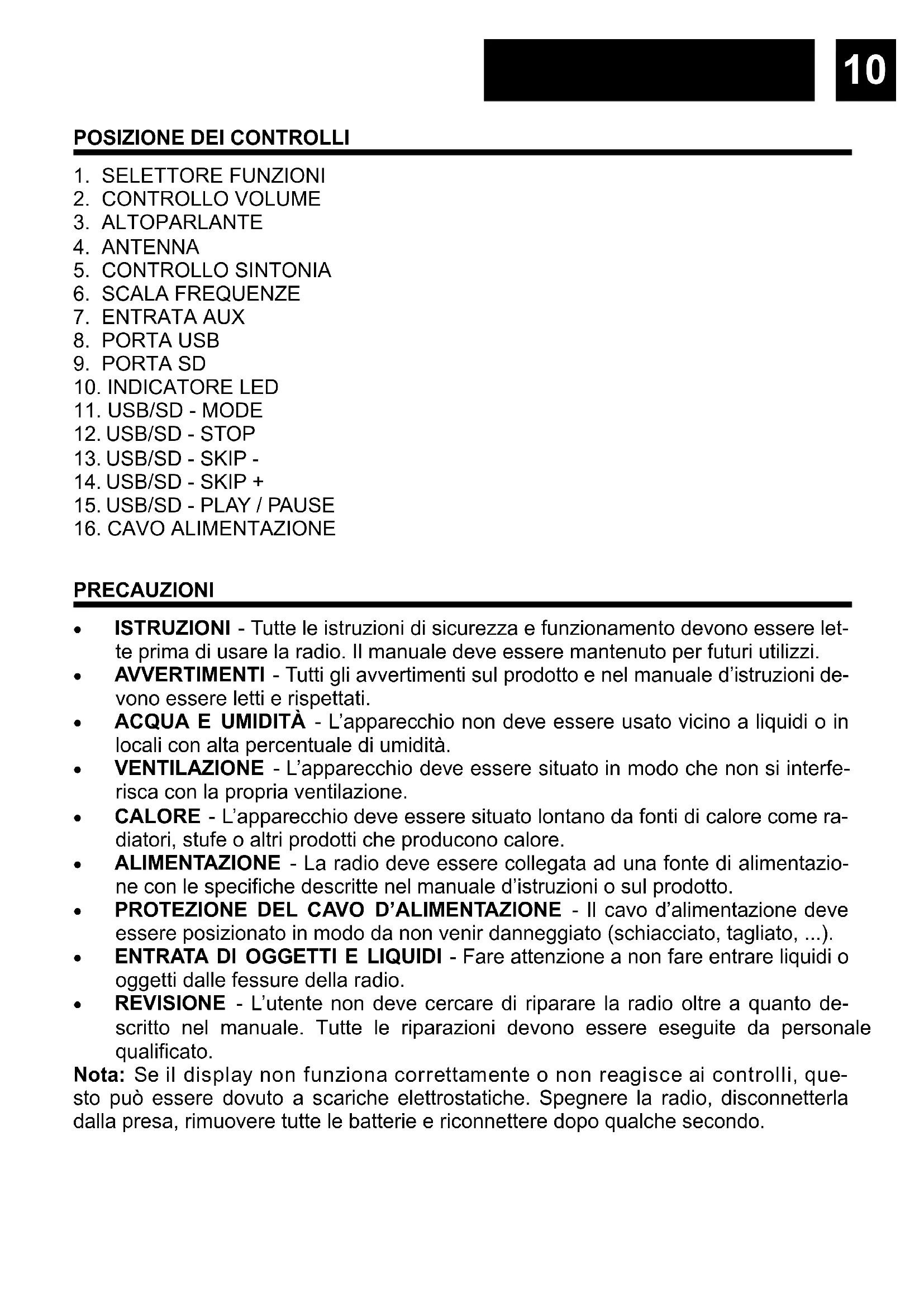 PRECAUZIONI ISTRUZIONI - Tutte le istruzioni di sicurezza e funzionamento devono essere let- te prima di usare la radio. Il manuale deve essere mantenuto per futuri utilizzi. AVVERTIMENTI - Tutti gli avvertimenti sul prodotto e nel manuale d’istruzioni de- vono essere letti e rispettati. ACQUA E UMIDITÀ - L’apparecchio non deve essere usato vicino a liquidi o in locali con alta percentuale di umidità. VENTILAZIONE - L’apparecchio deve essere situato in modo che non si interfe- risca con la propria ventilazione. CALORE - L’apparecchio deve essere situato lontano da fonti di calore come ra- diatori, stufe o altri prodotti che producono calore. ALIMENTAZIONE - La radio deve essere collegata ad una fonte di alimentazio- ne con le specifiche descritte nel manuale d’istruzioni o sul prodotto. PROTEZIONE DEL CAVO D’ALIMENTAZIONE - Il cavo d’alimentazione deve essere posizionato in modo da non venir danneggiato (schiacciato, tagliato, ...). ENTRATA DI OGGETTI E LIQUIDI - Fare attenzione a non fare entrare liquidi o oggetti dalle fessure della radio. REVISIONE - L’utente non deve cercare di riparare la radio oltre a quanto de- scritto nel manuale. Tutte le riparazioni devono essere eseguite da personale qualificato. Nota: Se il display non funziona correttamente o non reagisce ai controlli, que- sto può essere dovuto a scariche elettrostatiche. Spegnere la radio, disconnetterla dalla presa, rimuovere tutte le batterie e riconnettere dopo qualche secondo.11 Italiano