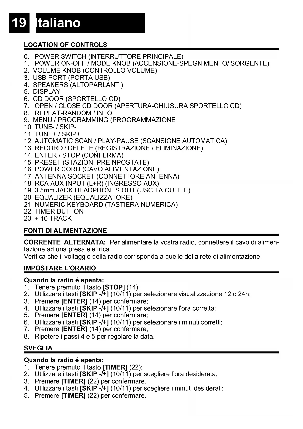 CORRENTE ALTERNATA: Per alimentare la vostra radio, connettere il cavo di alimen- tazione ad una presa elettrica. Verifica che il voltaggio della radio corrisponda a quello della rete di alimentazione. IMPOSTARE L'ORARIO Quando la radio é spenta: