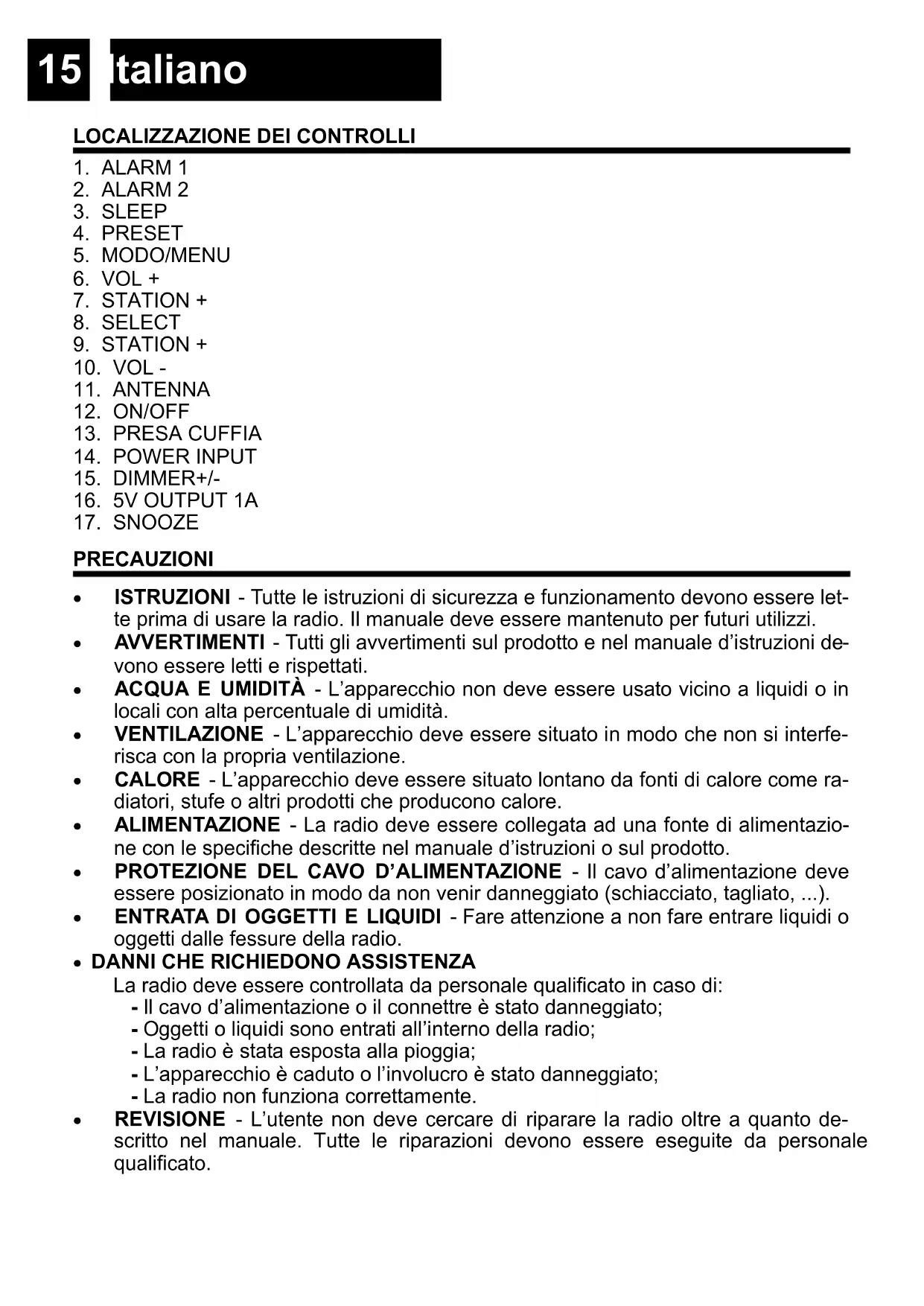 - DANNI CHE RICHIEDONO ASSISTENZA La radio deve essere controllata da personale qualificato in caso di: - Il cavo d’alimentazione o il connettre è stato danneggiato; - Oggetti o liquidi sono entrati all’interno della radio; - La radio è stata esposta alla pioggia; - L’apparecchio è caduto o l’involucro è stato danneggiato; - La radio non funziona correttamente.