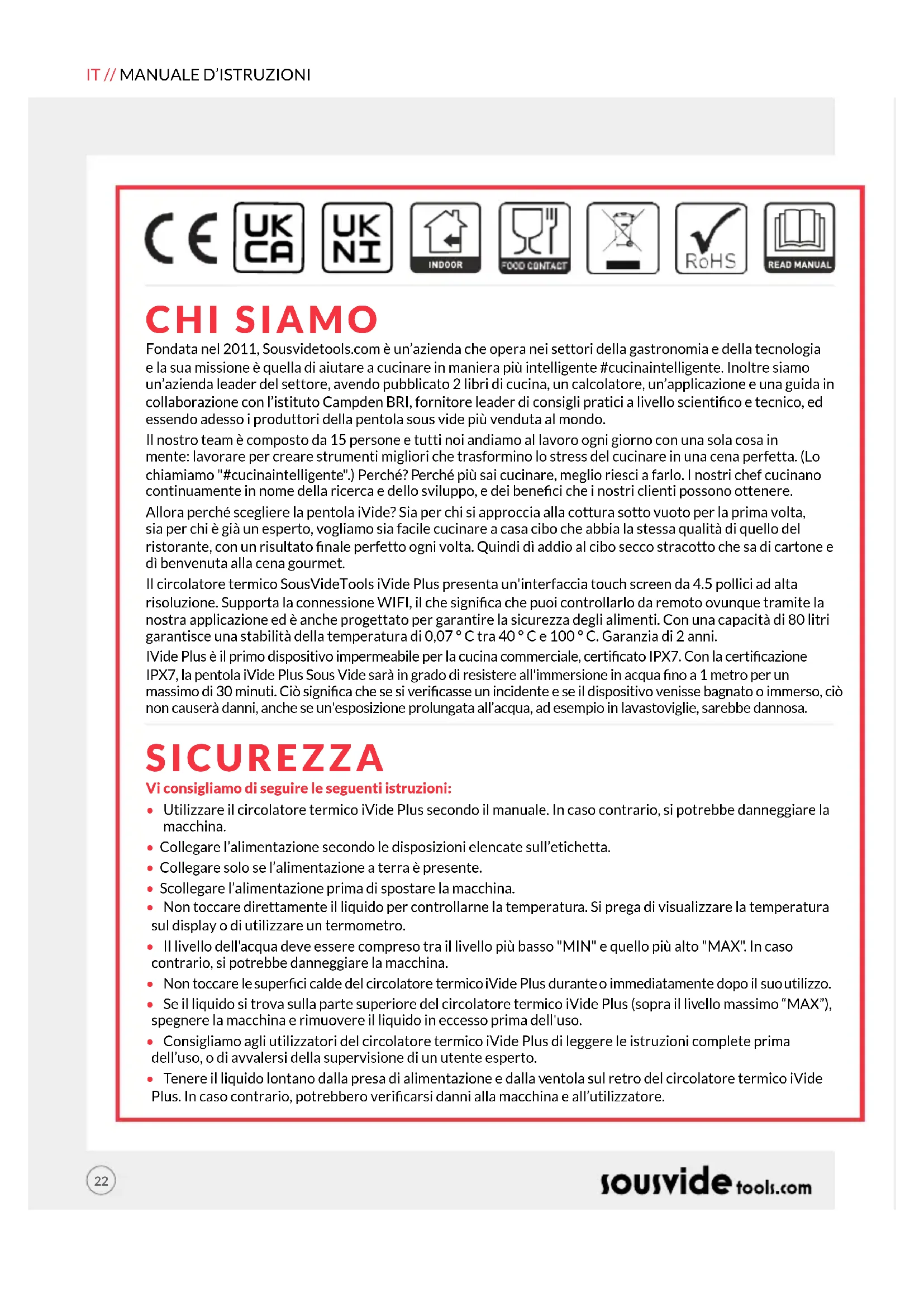 Datum / Ort Name: Alex Shannon Position: Geschäftsführender Direktor DE // BENUTZERHANDBUCH22 CHI SIAMO SICUREZZA Fondata nel 2011, Sousvidetools.com è un’azienda che opera nei settori della gastronomia e della tecnologia e la sua missione è quella di aiutare a cucinare in maniera più intelligente #cucinaintelligente. Inoltre siamo un’azienda leader del settore, avendo pubblicato 2 libri di cucina, un calcolatore, un’applicazione e una guida in collaborazione con l’istituto Campden BRI, fornitore leader di consigli pratici a livello scientico e tecnico, ed essendo adesso i produttori della pentola sous vide più venduta al mondo. Il nostro team è composto da 15 persone e tutti noi andiamo al lavoro ogni giorno con una sola cosa in mente: lavorare per creare strumenti migliori che trasformino lo stress del cucinare in una cena perfetta. (Lo chiamiamo "#cucinaintelligente".) Perché? Perché più sai cucinare, meglio riesci a farlo. I nostri chef cucinano continuamente in nome della ricerca e dello sviluppo, e dei beneci che i nostri clienti possono ottenere. Allora perché scegliere la pentola iVide? Sia per chi si approccia alla cottura sotto vuoto per la prima volta, sia per chi è già un esperto, vogliamo sia facile cucinare a casa cibo che abbia la stessa qualità di quello del ristorante, con un risultato nale perfetto ogni volta. Quindi dì addio al cibo secco stracotto che sa di cartone e dì benvenuta alla cena gourmet. Il circolatore termico SousVideTools iVide Plus presenta un'interfaccia touch screen da 4.5 pollici ad alta risoluzione. Supporta la connessione WIFI, il che signica che puoi controllarlo da remoto ovunque tramite la nostra applicazione ed è anche progettato per garantire la sicurezza degli alimenti. Con una capacità di 80 litri garantisce una stabilità della temperatura di 0,07 ° C tra 40 ° C e 100 ° C. Garanzia di 2 anni. IVide Plus è il primo dispositivo impermeabile per la cucina commerciale, certicato IPX7. Con la certicazione IPX7, la pentola iVide Plus Sous Vide sarà in grado di resistere all'immersione in acqua no a 1 metro per un massimo di 30 minuti. Ciò signica che se si vericasse un incidente e se il dispositivo venisse bagnato o immerso, ciò non causerà danni, anche se un'esposizione prolungata all’acqua, ad esempio in lavastoviglie, sarebbe dannosa.