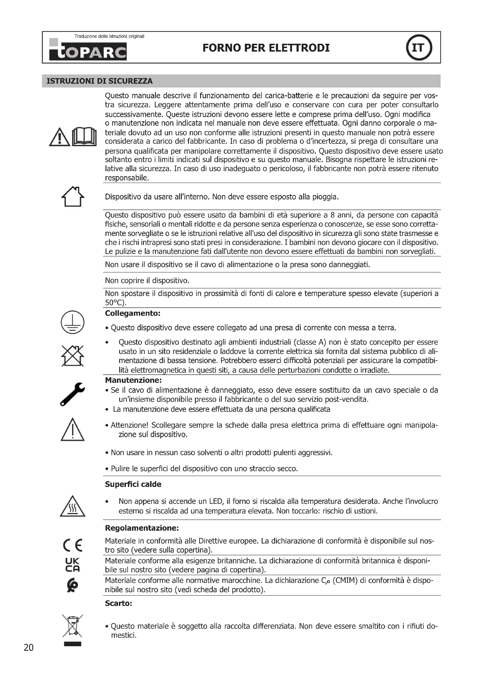 I tre forni sono dotati di un sistema di illuminazione per indicare lo stato di riscaldamento: - LED rosso: il riscaldamento è in corso, l’apparecchio non ha ancora raggiunto la temperatura richiesta. - LED verde: il dispositivo ha raggiunto la temperatura desiderata. Il forno è pronto a ricevere gli elettrodi rivestiti. Non appena si accende un LED, il forno si riscalda no alla temperatura desiderata. Anche il guscio esterno si riscalda ad alta temperatura. Non toccare il forno durante il suo funzionamento. Dopo lo spegnimento, attendere il rareddamento completo prima di procedere con la manutenzione. GARANZIA La garanzia copre qualsiasi difetto di fabbricazione per 2 anni, a partire dalla data d’acquisto (pezzi e mano d’opera). La garanzia non copre: