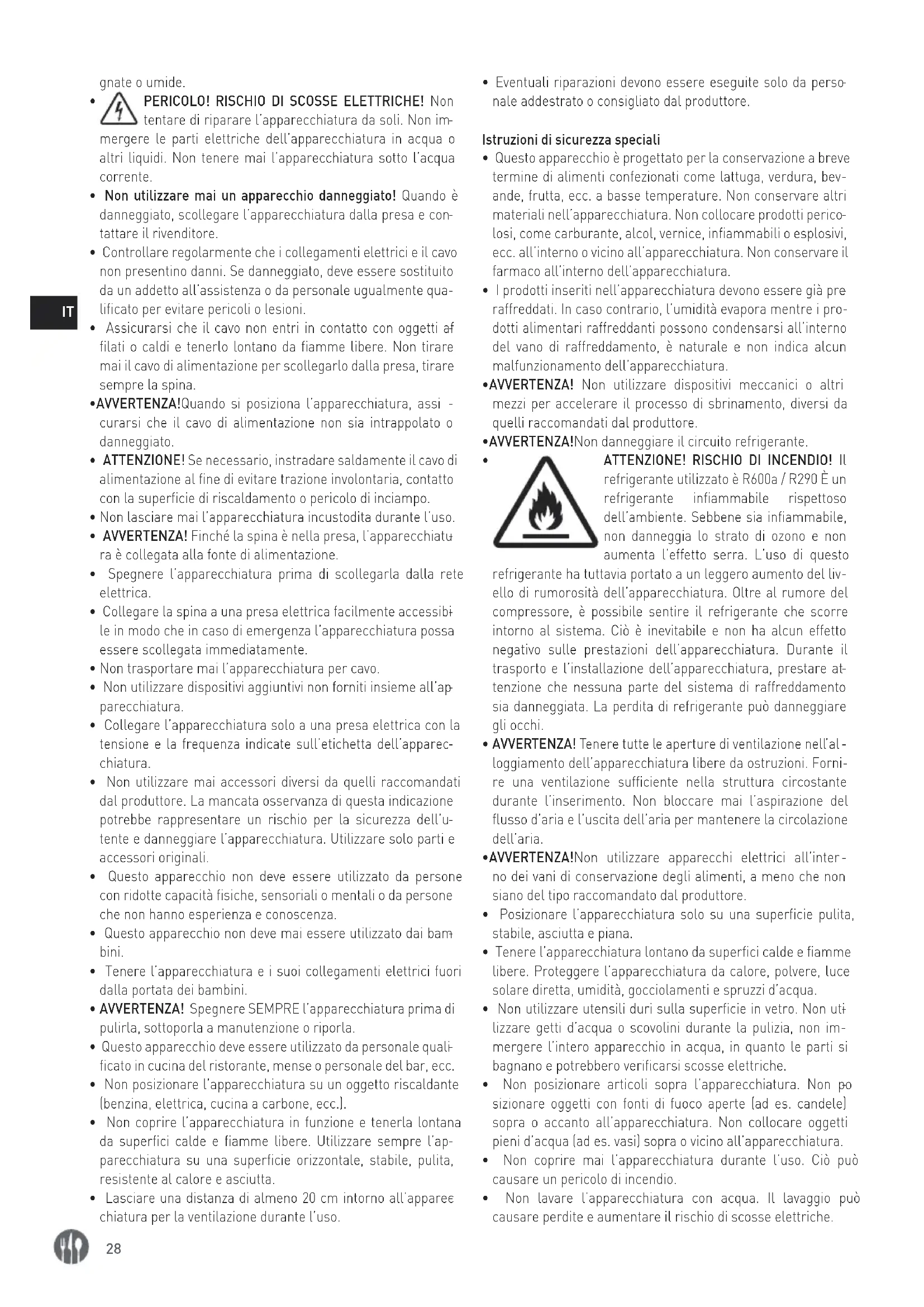 ATTENZIONE! RISCHIO DI INCENDIO! Il refrigerante utilizzato è R600a / R290 È un refrigerante infiammabile rispettoso dell’ambiente. Sebbene sia infiammabile, non danneggia lo strato di ozono e non aumenta l’effetto serra. L’uso di questo refrigerante ha tuttavia portato a un leggero aumento del liv
