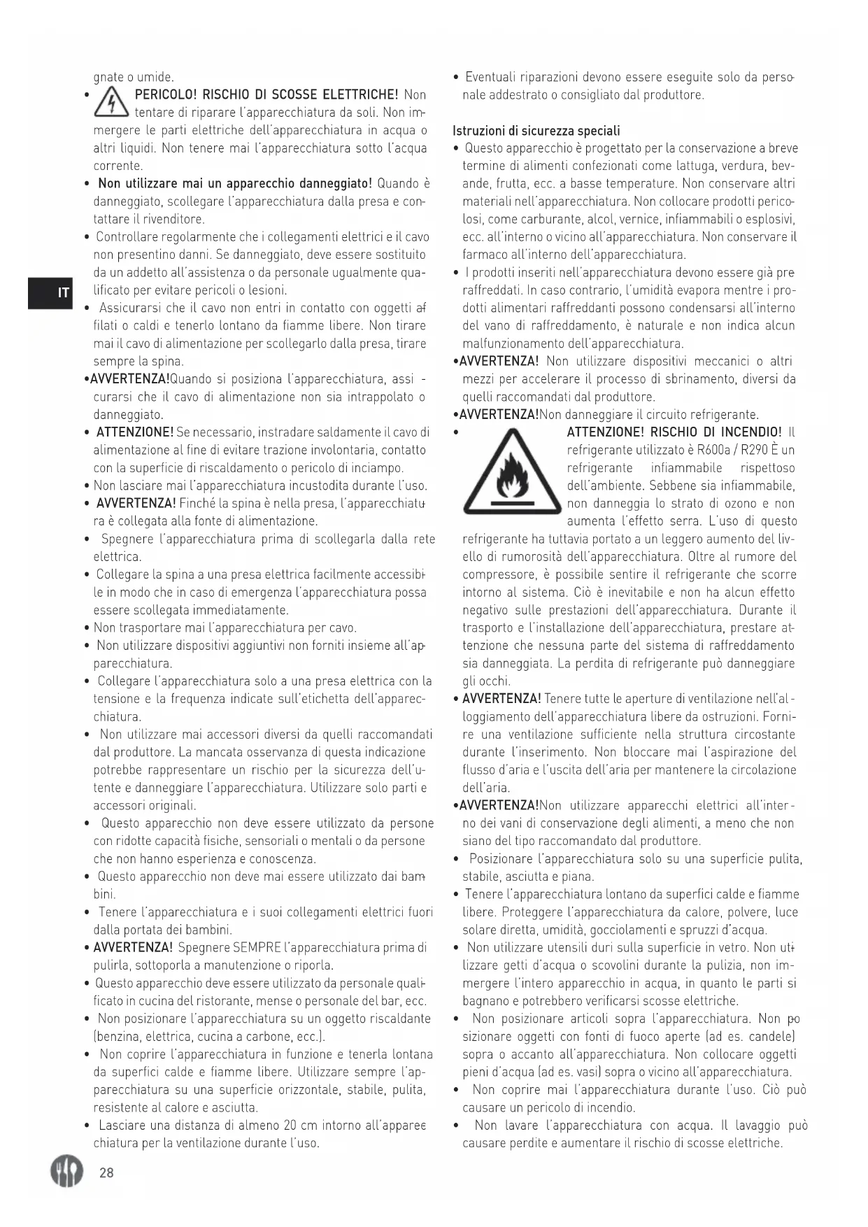 ATTENZIONE! RISCHIO DI INCENDIO! Il refrigerante utilizzato è R600a / R290 È un refrigerante infiammabile rispettoso dell’ambiente. Sebbene sia infiammabile, non danneggia lo strato di ozono e non aumenta l’effetto serra. L’uso di questo refrigerante ha tuttavia portato a un leggero aumento del liv