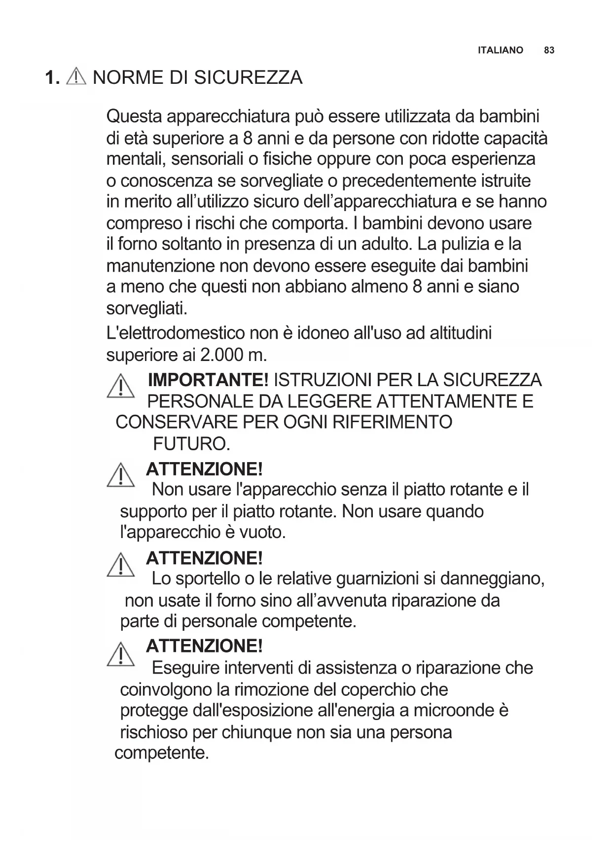 Questa apparecchiatura può essere utilizzata da bambini di età superiore a 8 anni e da persone con ridotte capacità mentali, sensoriali o siche oppure con poca esperienza o conoscenza se sorvegliate o precedentemente istruite in merito all’utilizzo sicuro dell’apparecchiatura e se hanno compreso i rischi che comporta. I bambini devono usare il forno soltanto in presenza di un adulto. La pulizia e la manutenzione non devono essere eseguite dai bambini a meno che questi non abbiano almeno 8 anni e siano sorvegliati. L'elettrodomestico non è idoneo all'uso ad altitudini superiore ai 2.000 m.