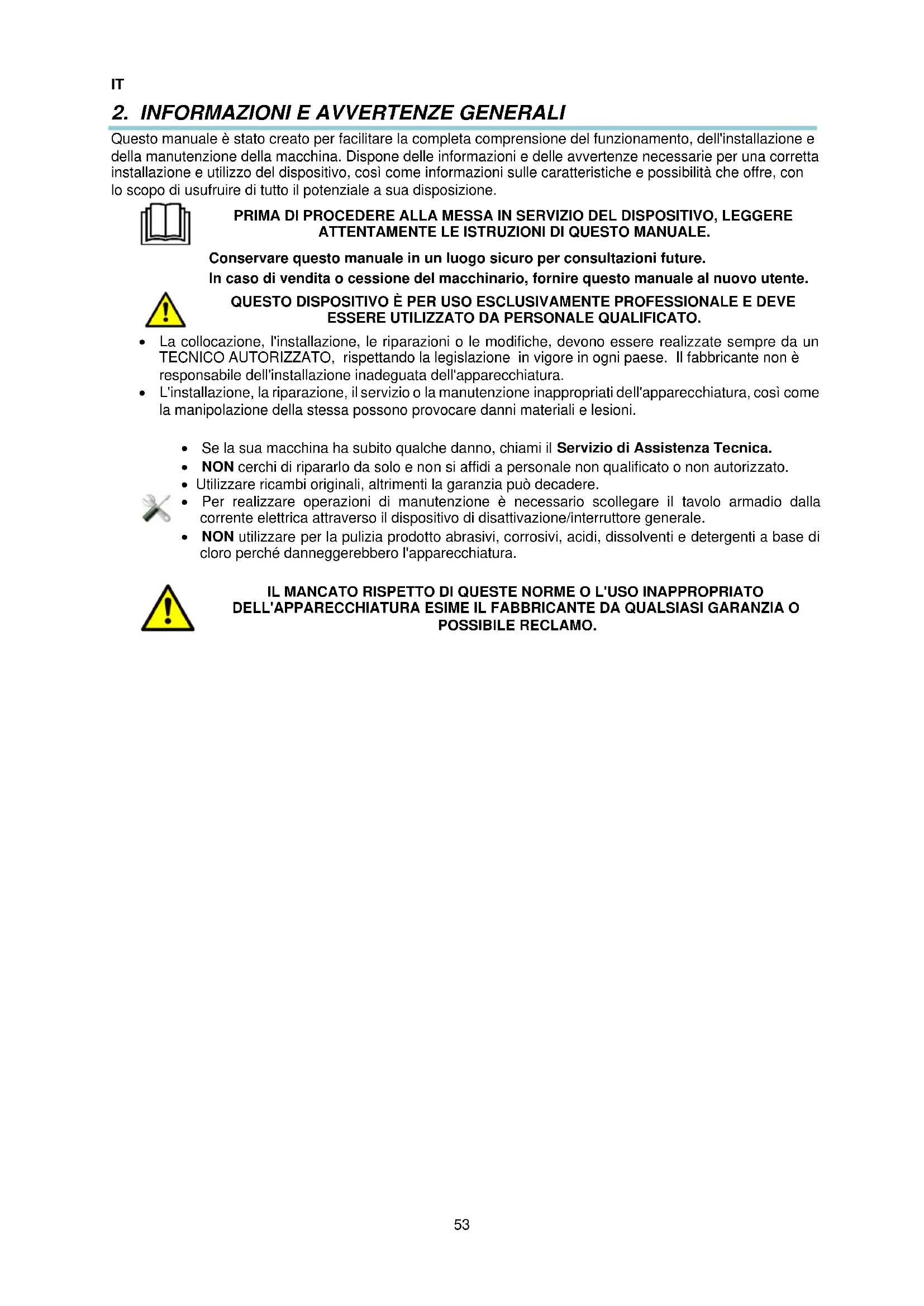 Non rispettare le indicazioni del fabbricante o un'inadeguata installazione, esime lo stesso da qualsiasi responsabilità. Il fabbricante non è responsabile dei danni personali o materiali che possa subire la macchina.