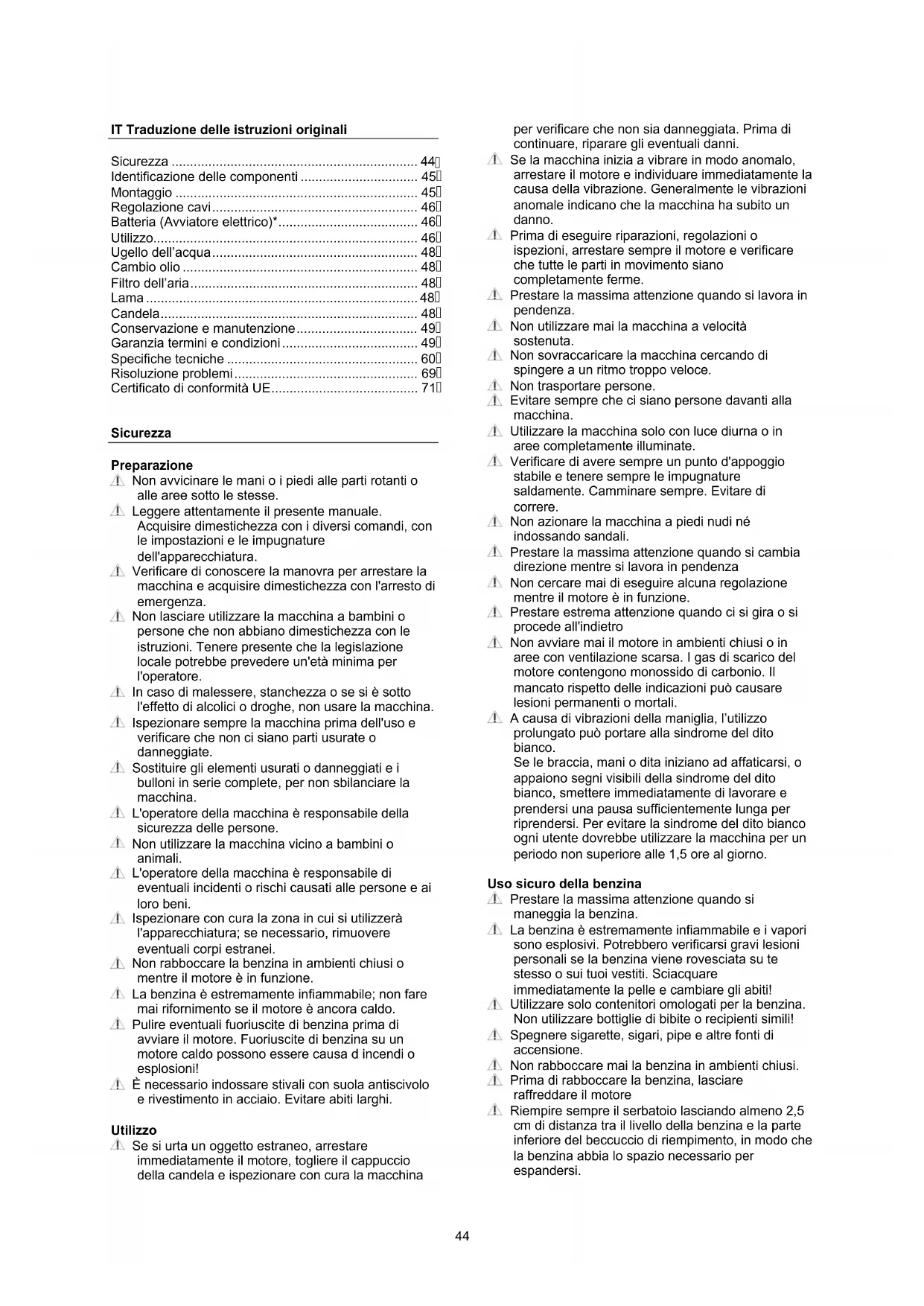 Sicurezza Preparazione Non avvicinare le mani o i piedi alle parti rotanti o alle aree sotto le stesse. Leggere attentamente il presente manuale. Acquisire dimestichezza con i diversi comandi, con le impostazioni e le impugnature dell'apparecchiatura. Verificare di conoscere la manovra per arrestare la macchina e acquisire dimestichezza con l'arresto di emergenza. Non lasciare utilizzare la macchina a bambini o persone che non abbiano dimestichezza con le istruzioni. Tenere presente che la legislazione locale potrebbe prevedere un'età minima per l'operatore. In caso di malessere, stanchezza o se si è sotto l'effetto di alcolici o droghe, non usare la macchina. Ispezionare sempre la macchina prima dell'uso e verificare che non ci siano parti usurate o danneggiate. Sostituire gli elementi usurati o danneggiati e i bulloni in serie complete, per non sbilanciare la macchina. L'operatore della macchina è responsabile della sicurezza delle persone. Non utilizzare la macchina vicino a bambini o animali. L'operatore della macchina è responsabile di eventuali incidenti o rischi causati alle persone e ai loro beni. Ispezionare con cura la zona in cui si utilizzerà l'apparecchiatura; se necessario, rimuovere eventuali corpi estranei. Non rabboccare la benzina in ambienti chiusi o mentre il motore è in funzione. La benzina è estremamente infiammabile; non fare mai rifornimento se il motore è ancora caldo. Pulire eventuali fuoriuscite di benzina prima di avviare il motore. Fuoriuscite di benzina su un motore caldo possono essere causa d incendi o esplosioni! È necessario indossare stivali con suola antiscivolo e rivestimento in acciaio. Evitare abiti larghi. Utilizzo Se si urta un oggetto estraneo, arrestare immediatamente il motore, togliere il cappuccio della candela e ispezionare con cura la macchina per verificare che non sia danneggiata. Prima di continuare, riparare gli eventuali danni. Se la macchina inizia a vibrare in modo anomalo, arrestare il motore e individuare immediatamente la causa della vibrazione. Generalmente le vibrazioni anomale indicano che la macchina ha subito un danno. Prima di eseguire riparazioni, regolazioni o ispezioni, arrestare sempre il motore e verificare che tutte le parti in movimento siano completamente ferme. Prestare la massima attenzione quando si lavora in pendenza. Non utilizzare mai la macchina a velocità sostenuta. Non sovraccaricare la macchina cercando di spingere a un ritmo troppo veloce. Non trasportare persone. Evitare sempre che ci siano persone davanti alla macchina. Utilizzare la macchina solo con luce diurna o in aree completamente illuminate. Verificare di avere sempre un punto d'appoggio stabile e tenere sempre le impugnature saldamente. Camminare sempre. Evitare di correre. Non azionare la macchina a piedi nudi né indossando sandali. Prestare la massima attenzione quando si cambia direzione mentre si lavora in pendenza Non cercare mai di eseguire alcuna regolazione mentre il motore è in funzione. Prestare estrema attenzione quando ci si gira o si procede all'indietro Non avviare mai il motore in ambienti chiusi o in aree con ventilazione scarsa. I gas di scarico del motore contengono monossido di carbonio. Il mancato rispetto delle indicazioni può causare lesioni permanenti o mortali. A causa di vibrazioni della maniglia, l’utilizzo prolungato può portare alla sindrome del dito bianco. Se le braccia, mani o dita iniziano ad affaticarsi, o appaiono segni visibili della sindrome del dito bianco, smettere immediatamente di lavorare e prendersi una pausa sufficientemente lunga per riprendersi. Per evitare la sindrome del dito bianco ogni utente dovrebbe utilizzare la macchina per un periodo non superiore alle 1,5 ore al giorno. Uso sicuro della benzina Prestare la massima attenzione quando si maneggia la benzina. La benzina è estremamente infiammabile e i vapori sono esplosivi. Potrebbero verificarsi gravi lesioni personali se la benzina viene rovesciata su te stesso o sui tuoi vestiti. Sciacquare immediatamente la pelle e cambiare gli abiti! Utilizzare solo contenitori omologati per la benzina. Non utilizzare bottiglie di bibite o recipienti simili! Spegnere sigarette, sigari, pipe e altre fonti di accensione. Non rabboccare mai la benzina in ambienti chiusi. Prima di rabboccare la benzina, lasciare raffreddare il motore Riempire sempre il serbatoio lasciando almeno 2,5 cm di distanza tra il livello della benzina e la parte inferiore del beccuccio di riempimento, in modo che la benzina abbia lo spazio necessario per espandersi.45 Dopo il rifornimento, verificare che il tappo sia ben chiuso. Durante il rifornimento, non utilizzare mai la funzione di blocco dell'erogatore della benzina. Non fumare durante il rabbocco della benzina. Non rabboccare mai la benzina all'interno di un edificio o in un ambiente in cui i vapori benzina possano entrare in contatto con una fonte di accensione. Tenere la benzina e il motore lontano da elettrodomestici, luci pilota, barbecue, apparecchiature elettriche, utensili elettrici e così via. Manutenzione e conservazione Durante le operazioni di manutenzione e di pulizia, quando si cambiano gli utensili e durante il trasporto su mezzi, il motore deve essere arrestato. Controllare regolarmente che tutti bulloni e i dadi siano serrati. Se necessario, serrarli nuovamente. Prima di riporre la macchina all'interno o di coprirla, il motore deve essersi raffreddato completamente. Se la macchina rimane inutilizzata per un certo periodo, consultare le istruzioni contenute nel presente manuale. Controllare e sostituire le etichette di sicurezza e quelle delle istruzioni, se necessario. Utilizzare solo ricambi o accessori originali. Se si utilizzano ricambi o accessori non originali, la garanzia decade. Varie Il motore non è pre-riempito di olio. Prima di avviare controllare sempre il livello del motore. I dispositivi di comando montati in fabbrica, come il cavo della frizione sull'impugnatura, non devono essere r